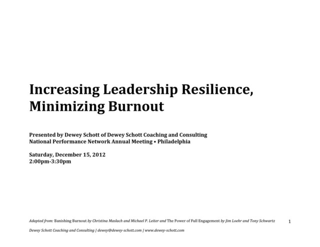 P. Leiter and The Power of Full Engagement by Jim Loehr and Tony Schwartz Dewey Schott Coaching and Consulting | dewey@dewey-schott.com | www.dewey-schott.com 11 Full Engagement Principles Managing energy, not time, is the key to high performance Full engagement requires drawing on four separate but related dimensions of energy: physical emotional, mental and spiritual. Because energy capacity diminishes with both overuse and underuse, we must learn to balance energy expenditure with intermittent energy renewal (cycles of work/rest, work/rest). To build capacity, we must push beyond our normal limits, training in the same systematic way that elite athletes do. Positive energy rituals—highly specific routines for managing energy— are key to full engagement and sustained high performance.