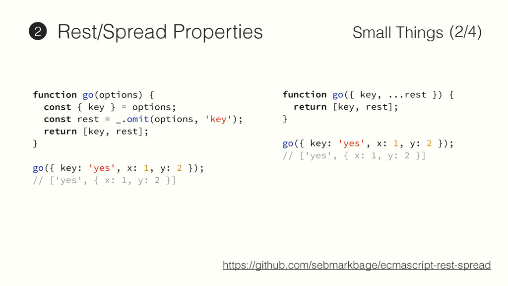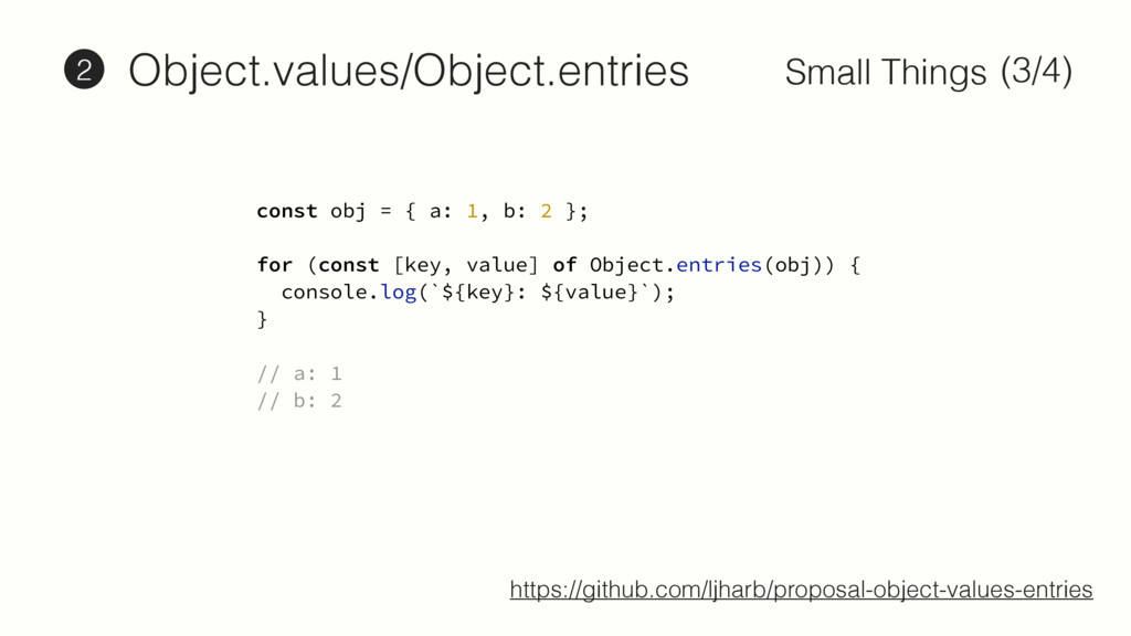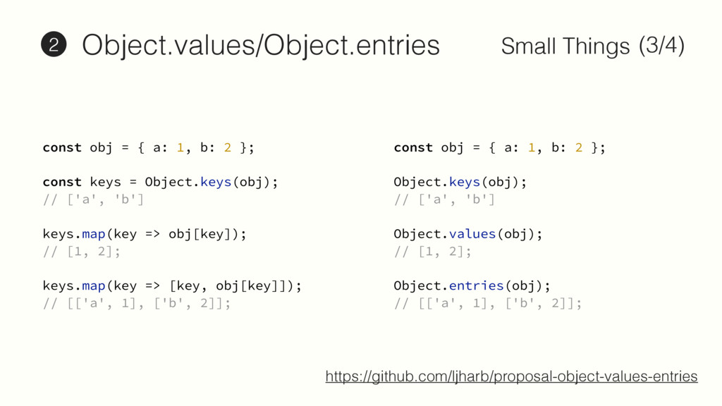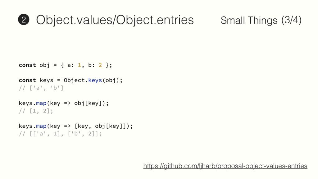 2 }; const keys = Object.keys(obj); // ['a', 'b'] keys.map(key => obj[key]); // [1, 2]; keys.map(key => [key, obj[key]]); // [['a', 1], ['b', 2]]; const obj = { a: 1, b: 2 }; const keys = Object.keys(obj); // ['a', 'b'] keys.map(key => obj[key]); // [1, 2]; keys.map(key => [key, obj[key]]); // [['a', 1], ['b', 2]]; https://github.com/ljharb/proposal-object-values-entries Object.values/Object.entries 2