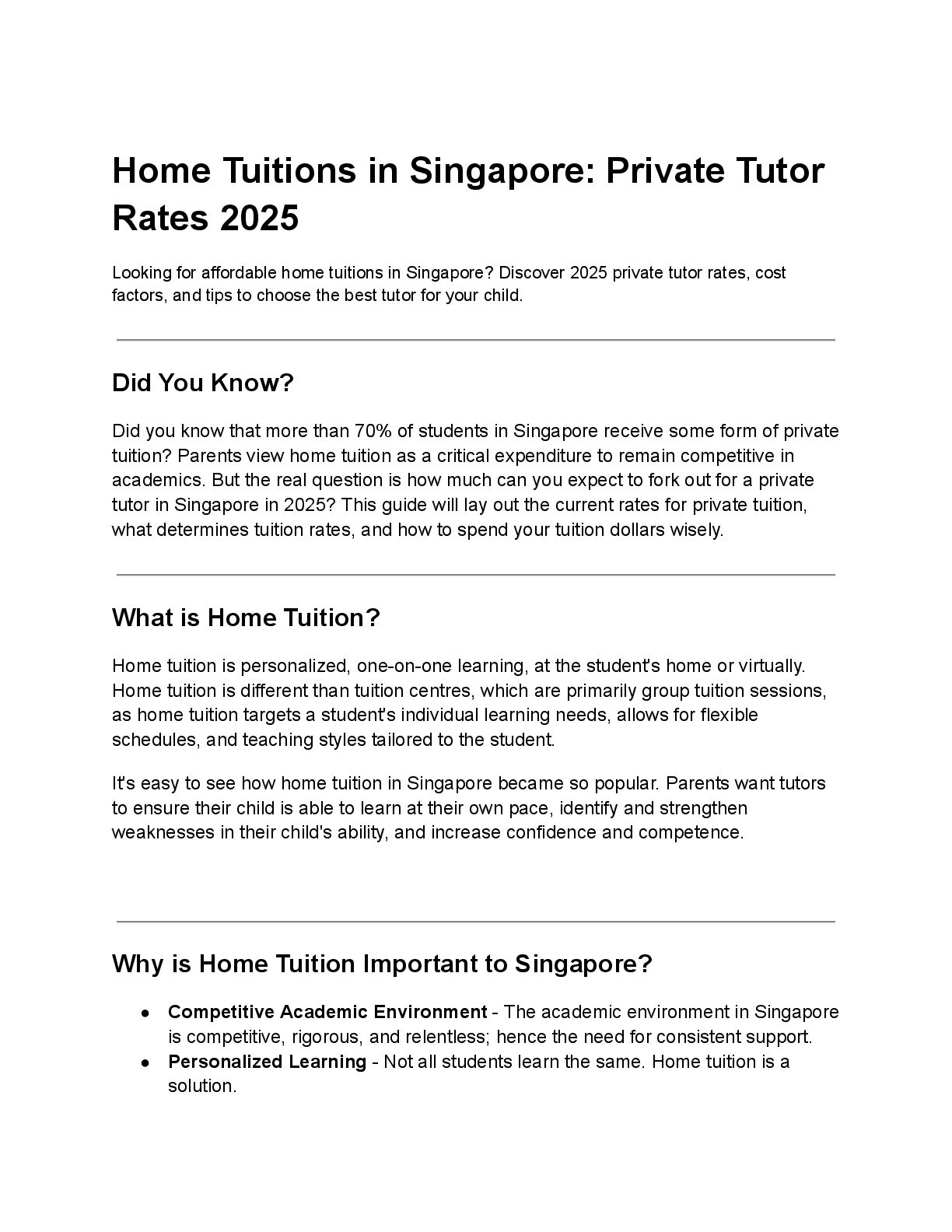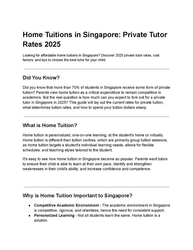 affordable home tuitions in Singapore? Discover 2025 private tutor rates, cost factors, and tips to choose the best tutor for your child. Did You Know? Did you know that more than 70% of students in Singapore receive some form of private tuition? Parents view home tuition as a critical expenditure to remain competitive in academics. But the real question is how much can you expect to fork out for a private tutor in Singapore in 2025? This guide will lay out the current rates for private tuition, what determines tuition rates, and how to spend your tuition dollars wisely. What is Home Tuition? Home tuition is personalized, one-on-one learning, at the student's home or virtually. Home tuition is different than tuition centres, which are primarily group tuition sessions, as home tuition targets a student's individual learning needs, allows for flexible schedules, and teaching styles tailored to the student. It's easy to see how home tuition in Singapore became so popular. Parents want tutors to ensure their child is able to learn at their own pace, identify and strengthen weaknesses in their child's ability, and increase confidence and competence. Why is Home Tuition Important to Singapore? • Competitive Academic Environment - The academic environment in Singapore is competitive, rigorous, and relentless; hence the need for consistent support. • Personalized Learning - Not all students learn the same. Home tuition is a solution.