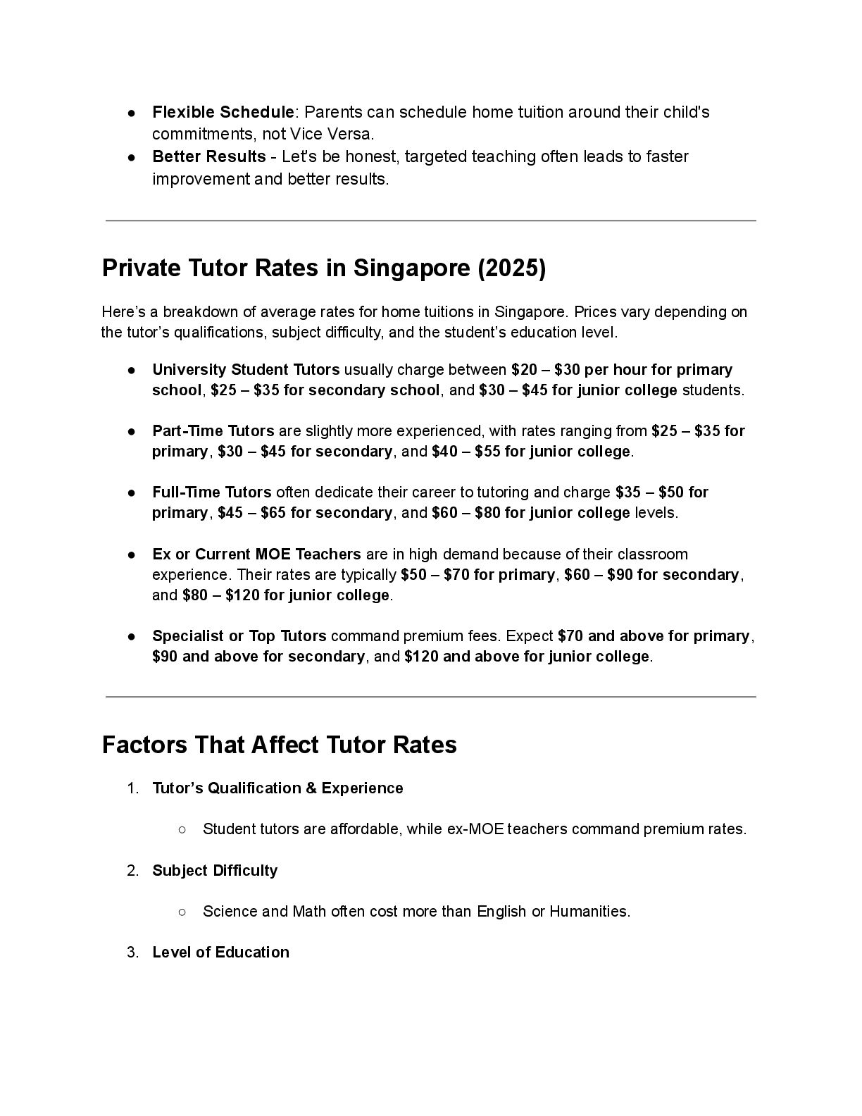 child's commitments, not Vice Versa. • Better Results - Let's be honest, targeted teaching often leads to faster improvement and better results. Private Tutor Rates in Singapore (2025) Here’s a breakdown of average rates for home tuitions in Singapore. Prices vary depending on the tutor’s qualifications, subject difficulty, and the student’s education level. • University Student Tutors usually charge between $20 – $30 per hour for primary school, $25 – $35 for secondary school, and $30 – $45 for junior college students. • Part-Time Tutors are slightly more experienced, with rates ranging from $25 – $35 for primary, $30 – $45 for secondary, and $40 – $55 for junior college. • Full-Time Tutors often dedicate their career to tutoring and charge $35 – $50 for primary, $45 – $65 for secondary, and $60 – $80 for junior college levels. • Ex or Current MOE Teachers are in high demand because of their classroom experience. Their rates are typically $50 – $70 for primary, $60 – $90 for secondary, and $80 – $120 for junior college. • Specialist or Top Tutors command premium fees. Expect $70 and above for primary, $90 and above for secondary, and $120 and above for junior college. Factors That Affect Tutor Rates 1. Tutor’s Qualification & Experience ◦ Student tutors are affordable, while ex-MOE teachers command premium rates. 2. Subject Difficulty ◦ Science and Math often cost more than English or Humanities. 3. Level of Education