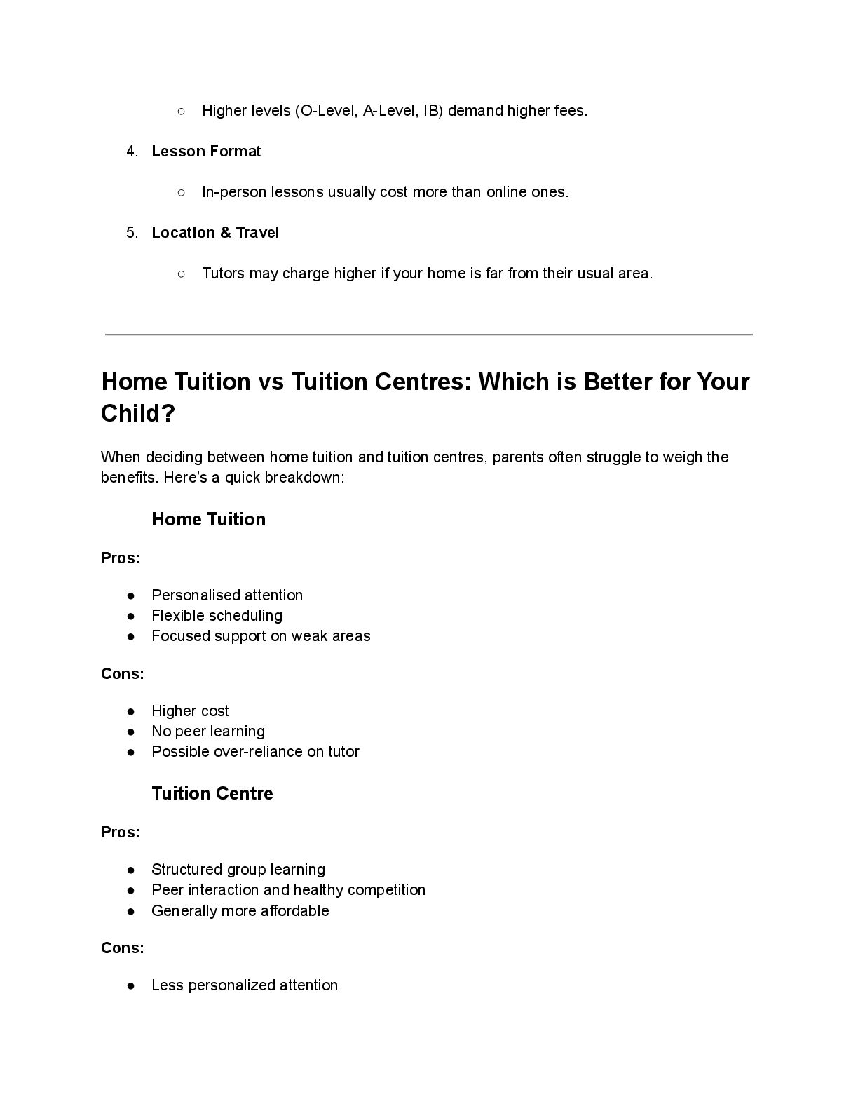 Lesson Format ◦ In-person lessons usually cost more than online ones. 5. Location & Travel ◦ Tutors may charge higher if your home is far from their usual area. Home Tuition vs Tuition Centres: Which is Better for Your Child? When deciding between home tuition and tuition centres, parents often struggle to weigh the benefits. Here’s a quick breakdown: Home Tuition Pros: • Personalised attention • Flexible scheduling • Focused support on weak areas Cons: • Higher cost • No peer learning • Possible over-reliance on tutor Tuition Centre Pros: • Structured group learning • Peer interaction and healthy competition • Generally more affordable Cons: • Less personalized attention