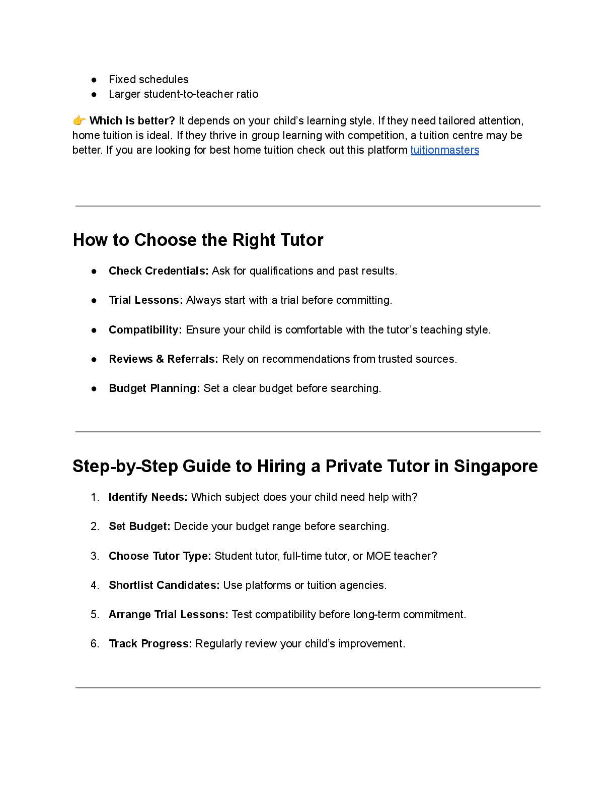 better? It depends on your child’s learning style. If they need tailored attention, home tuition is ideal. If they thrive in group learning with competition, a tuition centre may be better. If you are looking for best home tuition check out this platform tuitionmasters How to Choose the Right Tutor • Check Credentials: Ask for qualifications and past results. • Trial Lessons: Always start with a trial before committing. • Compatibility: Ensure your child is comfortable with the tutor’s teaching style. • Reviews & Referrals: Rely on recommendations from trusted sources. • Budget Planning: Set a clear budget before searching. Step-by-Step Guide to Hiring a Private Tutor in Singapore 1. Identify Needs: Which subject does your child need help with? 2. Set Budget: Decide your budget range before searching. 3. Choose Tutor Type: Student tutor, full-time tutor, or MOE teacher? 4. Shortlist Candidates: Use platforms or tuition agencies. 5. Arrange Trial Lessons: Test compatibility before long-term commitment. 6. Track Progress: Regularly review your child’s improvement.