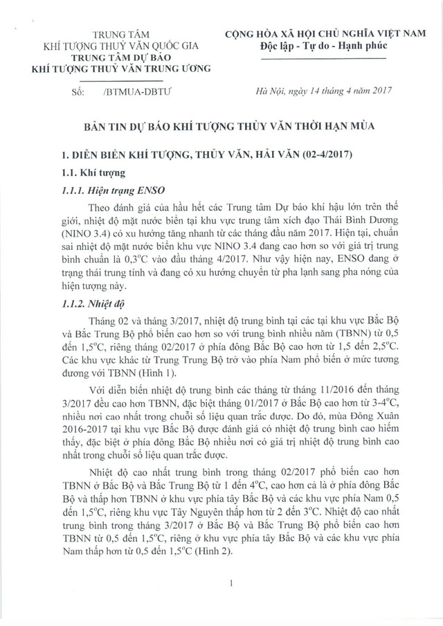 BẢN TIN DỰ BÁO KHÍ TƯỢNG THỦY VĂN THỜI HẠN MÙA