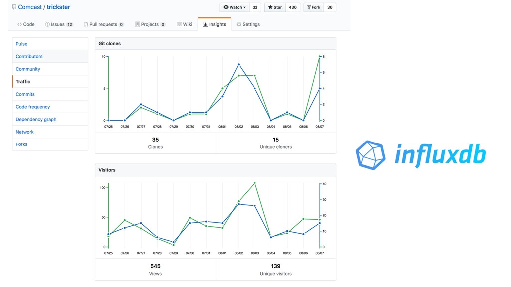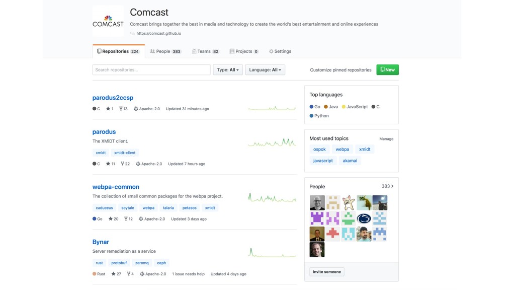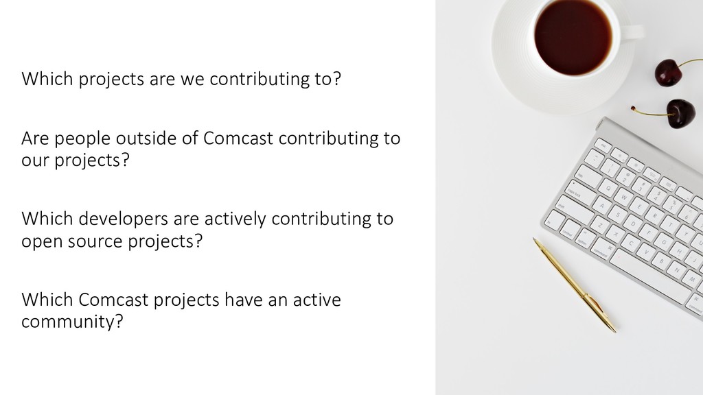 Using collection methods from github.com, Comcast is tracking open source contributions in order to measure project health and where our developers are contributing to projects outside of Comcast. By using the traffic insights and the event stream available from GitHub, we are able to track the age of issues, pull requests, and contributions across the organization.