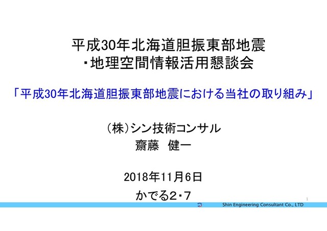Shin Engineering Consultant Co., LTD 1 平成30年北海道胆振東部地震 ・地理空間情報活用懇談会 「平成30年北海道胆振東部地震における当社の取り組み」 (株)シン技術コンサル