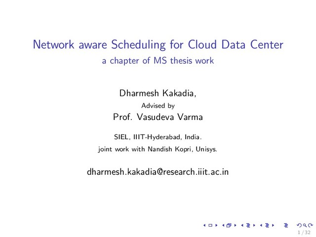 Pacifici. A scalable application placement controller for enterprise data centers. (WWW’2007) 2. J. Piao and J. Yan. A network-aware virtual machine placement and migration approach in cloud computing. (GCC’2010) 3. S. K. Garg and R. Buyya. Networkcloudsim: Modeling parallel applications in cloud simulations. (UCC’2011) 4. T. Benson, A. Akella, and D. A. Maltz. Network traffic characteristics of data centers in the wild. (IMC’2010) 30 / 32