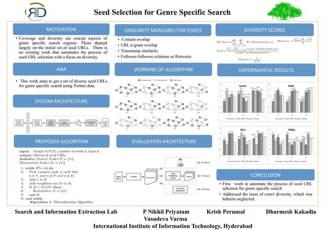 Lab P Nikhil Priyatam Krish Perumal Dharmesh Kakadia Vasudeva Varma International Institute of Information Technology, Hyderabad AIM • This work aims to get a set of diverse seed URLs for genre specific search using Twitter data. SYSTEM ARCHITECTURE PROPOSED ALGORITHM WORKING OF ALGORITHM EVALUATION ARCHITECTURE EXPERIMENTAL RESULTS MOTIVATION • Coverage and diversity are crucial aspects of genre specific search engines. These depend largely on the initial set of seed URLs. There is no existing work that automates the process of seed URL selection with a focus on diversity. CONCLUSION • First work to automate the process of seed URL selection for genre specific search • Addressed the issue of crawl diversity, which was hitherto neglected. DIVERSITY SCORES SIMILARITY MEASURES FOR EDGES • Content overlap • URL n-gram overlap • Timestamp similarity • Follower-followee relations or Retweets