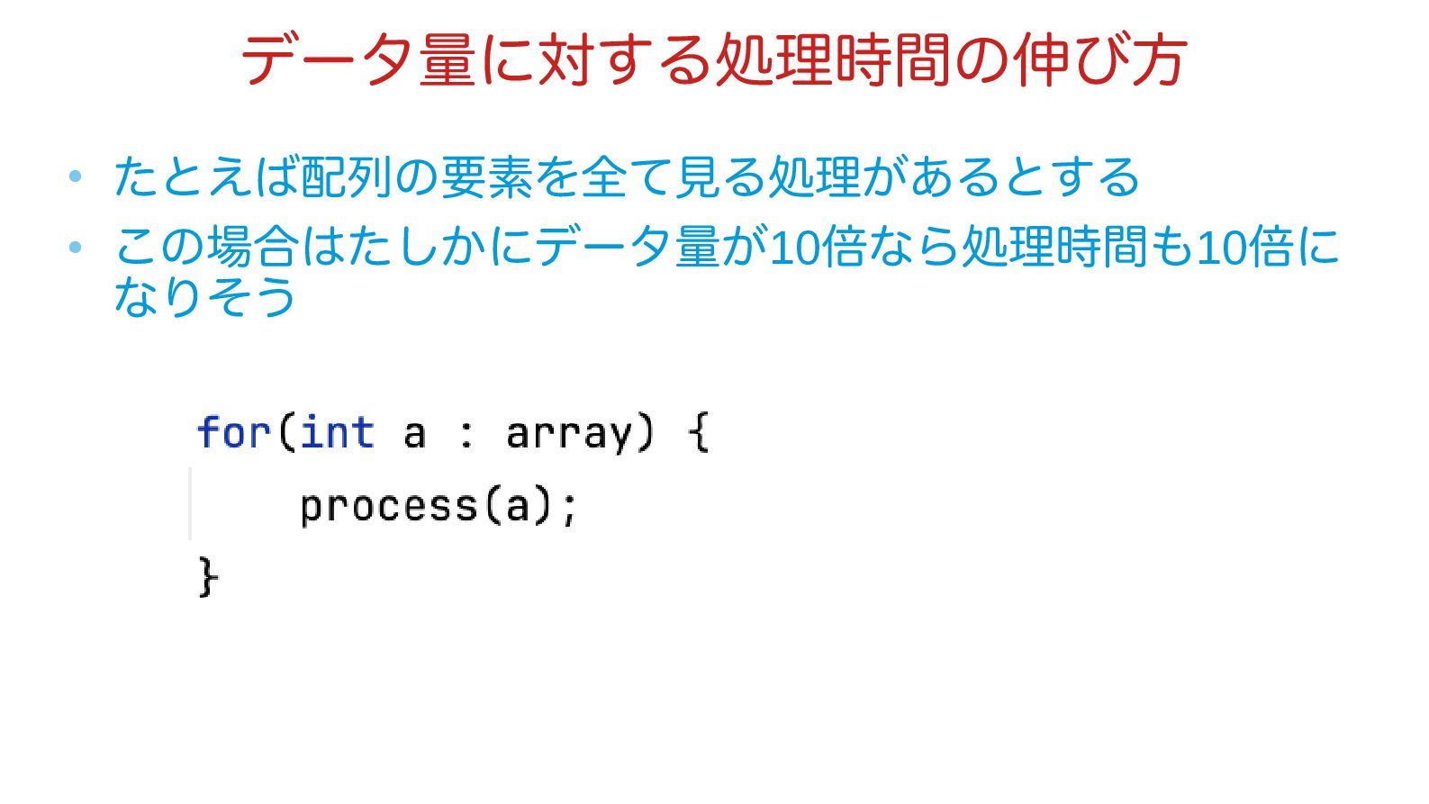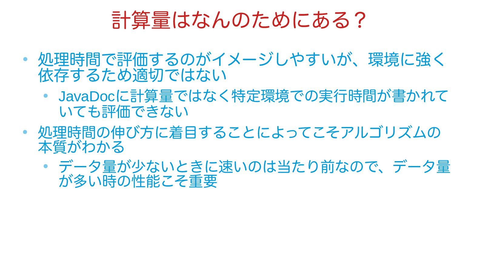 40 計算量はなんのためにある? • 処理時間で評価するのがイメージしやすいが、環境に強く 依存するため適切ではない • JavaDocに計算量ではなく特定環境での実行時間が書かれて いても評価できない • 処理時間の伸び方に着目することによってこそアルゴリズムの