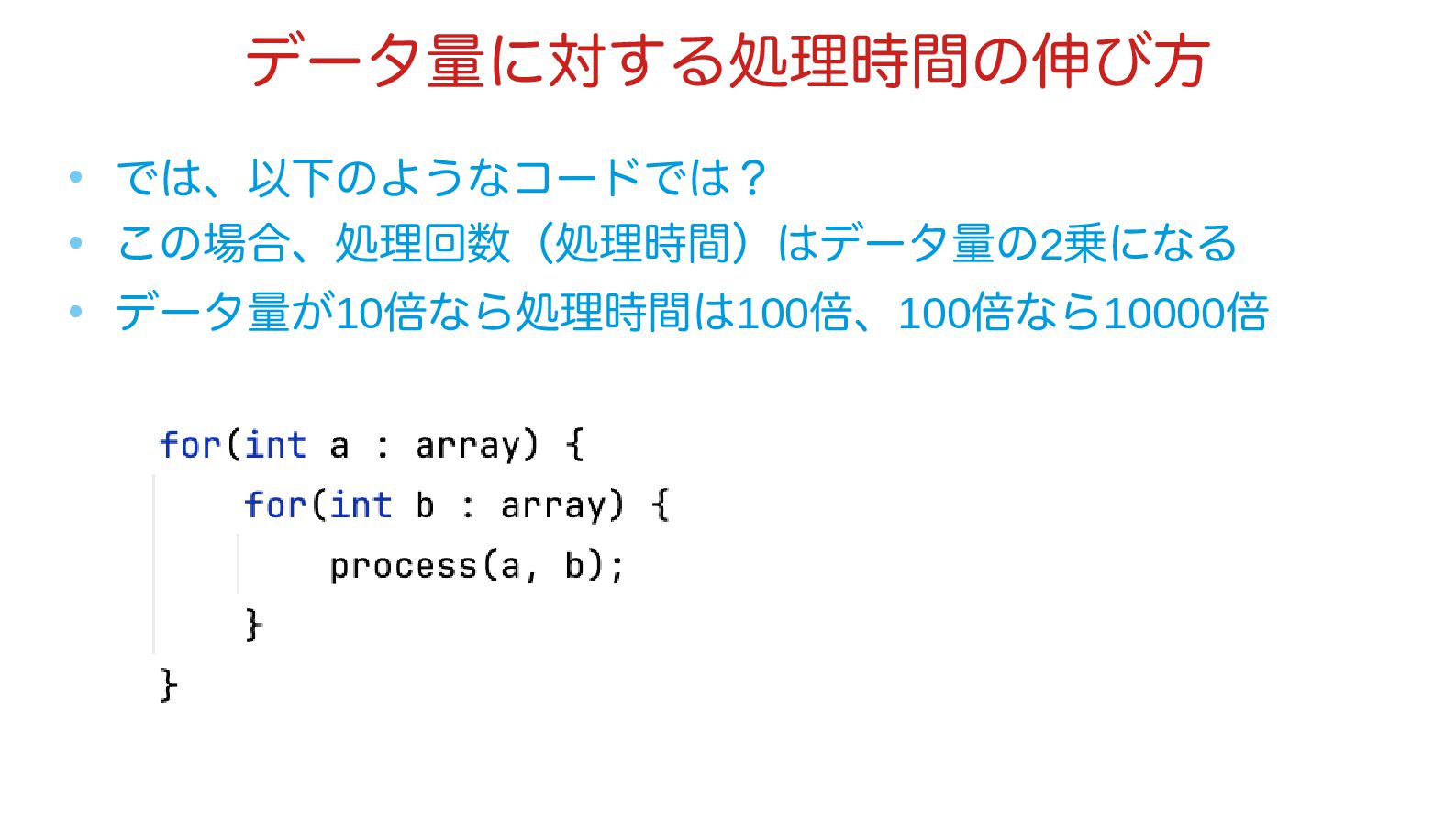 12 データ量に対する処理時間の伸び方 • では、以下のようなコードでは? • この場合、処理回数(処理時間)はデータ量の2乗になる • データ量が10倍なら処理時間は100倍、100倍なら10000倍