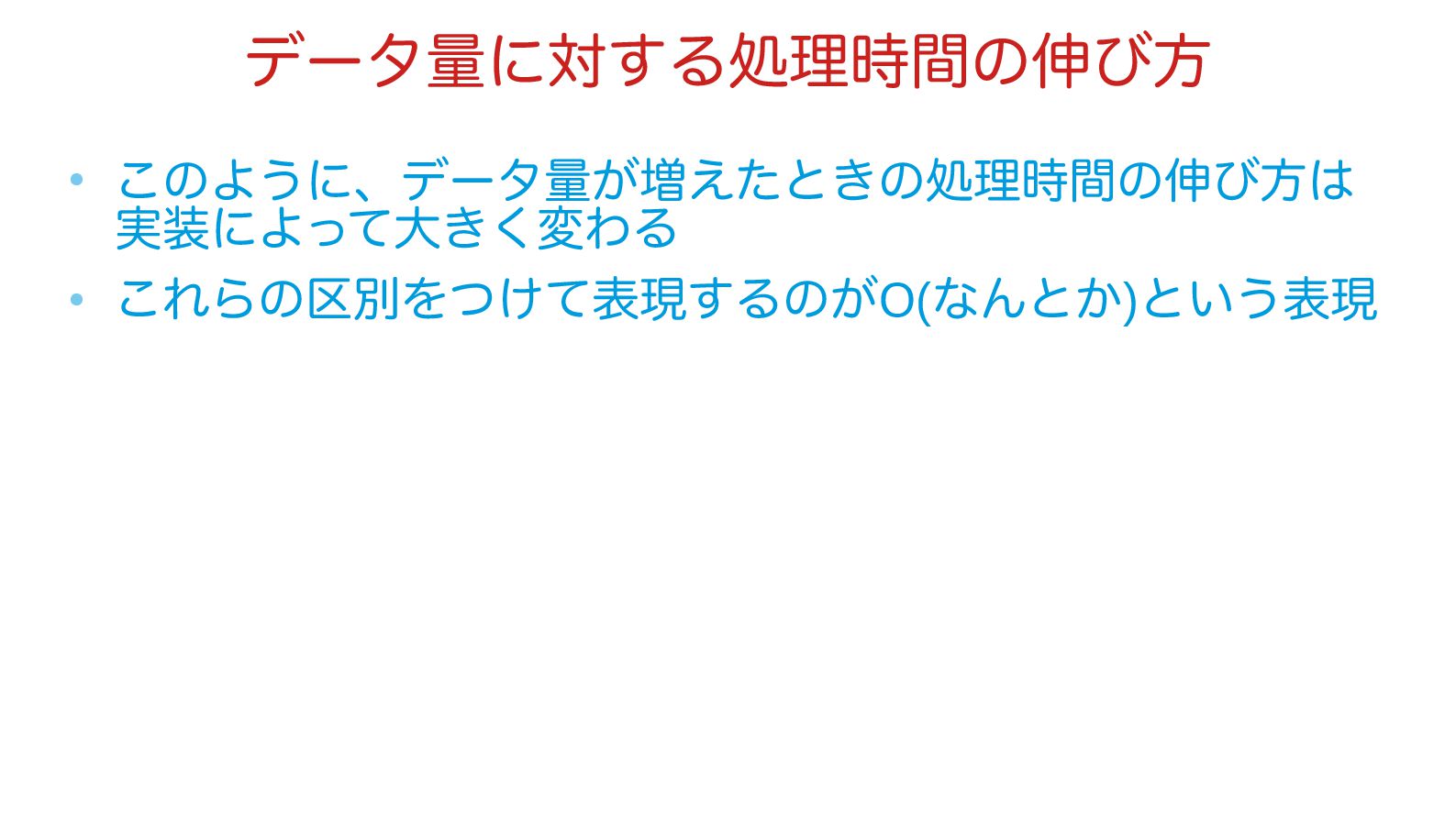 13 データ量に対する処理時間の伸び方 • このように、データ量が増えたときの処理時間の伸び方は 実装によって大きく変わる • これらの区別をつけて表現するのがO(なんとか)という表現