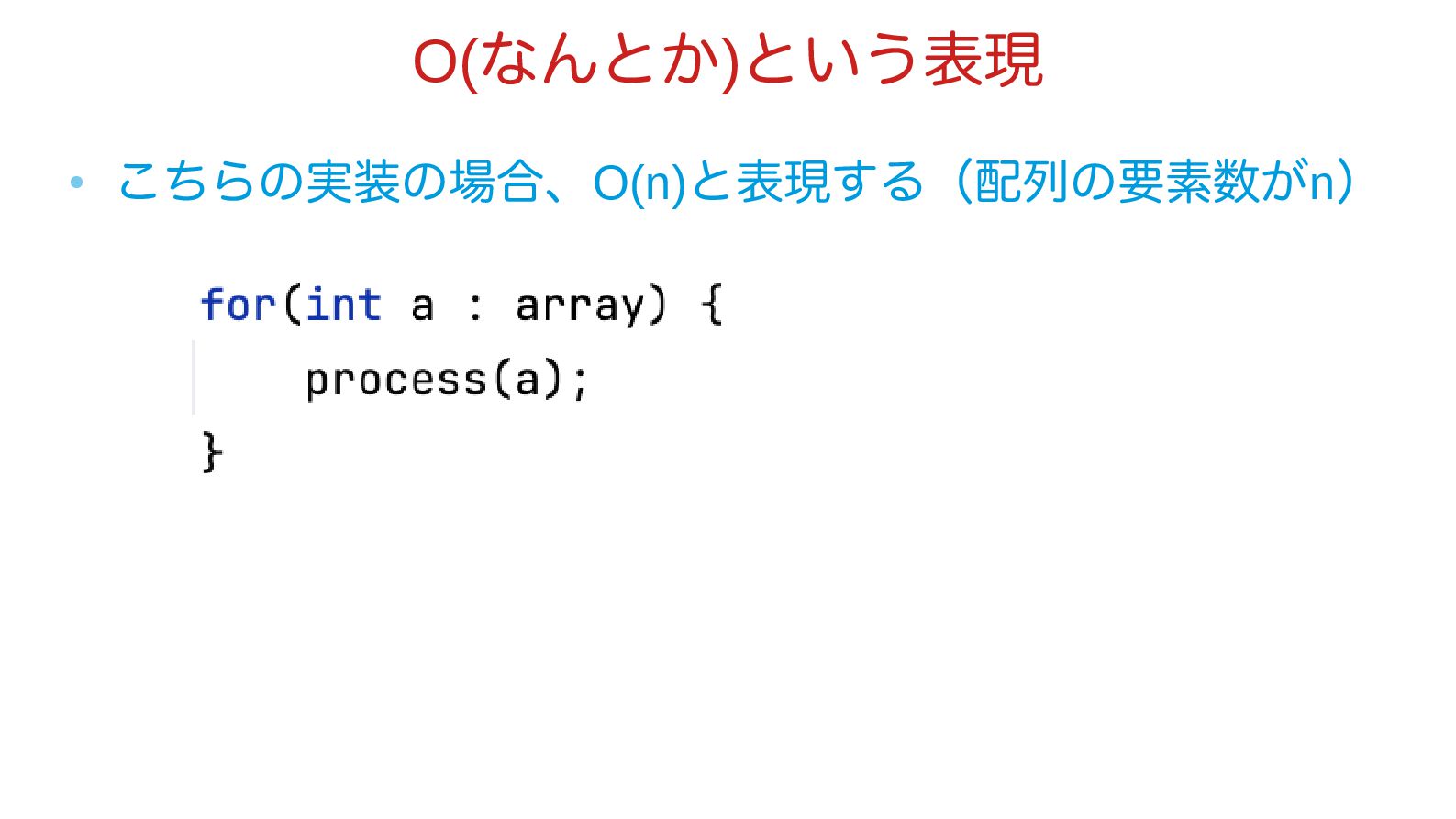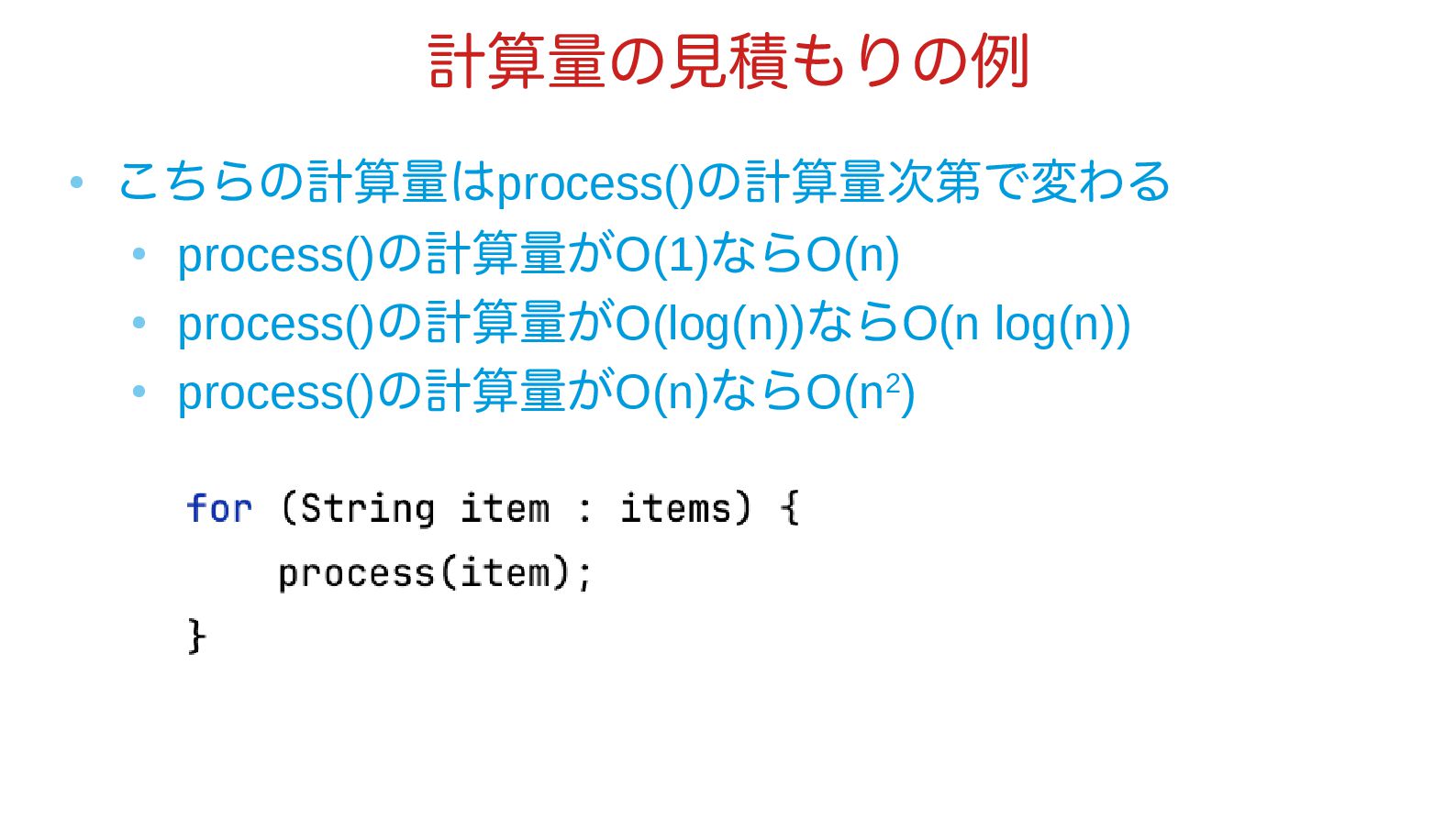 33 計算量の見積もりの例 • こちらの計算量はprocess()の計算量次第で変わる • process()の計算量がO(1)ならO(n) • process()の計算量がO(log(n))ならO(n log(n)) •