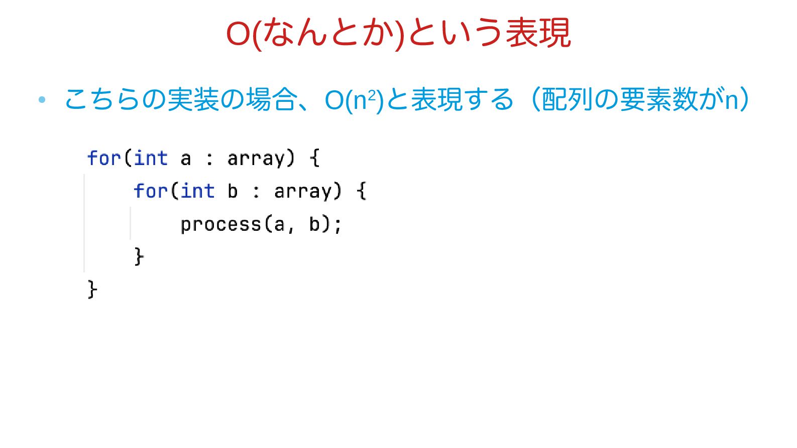 15 O(なんとか)という表現 • こちらの実装の場合、O(n2)と表現する(配列の要素数がn)