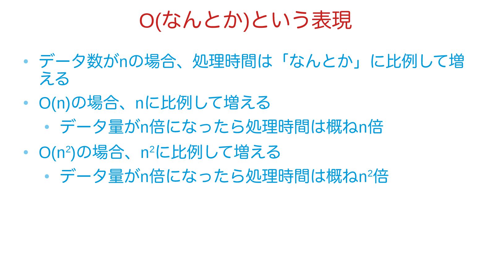 16 O(なんとか)という表現 • データ数がnの場合、処理時間は「なんとか」に比例して増 える • O(n)の場合、nに比例して増える • データ量がn倍になったら処理時間は概ねn倍 •