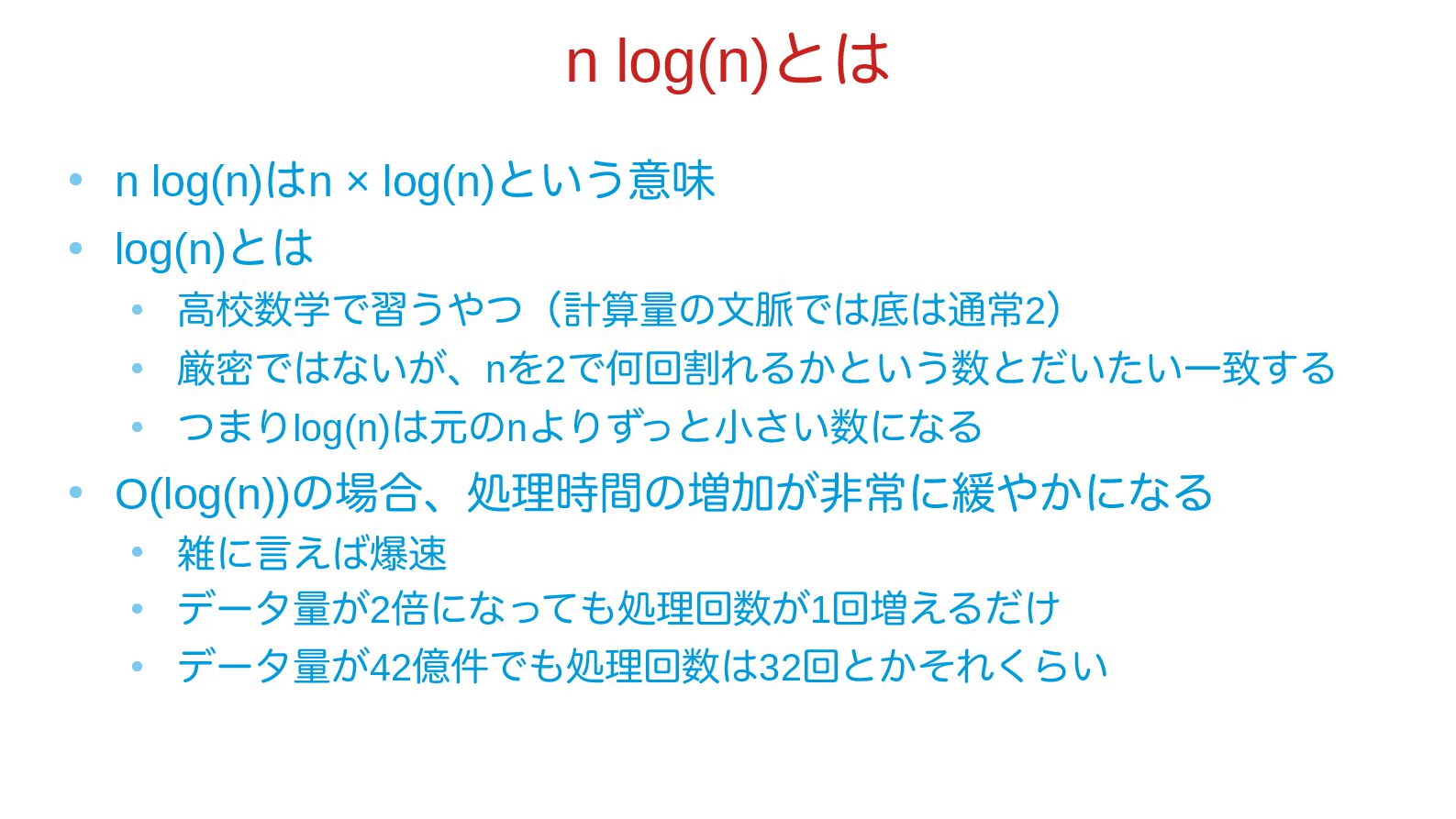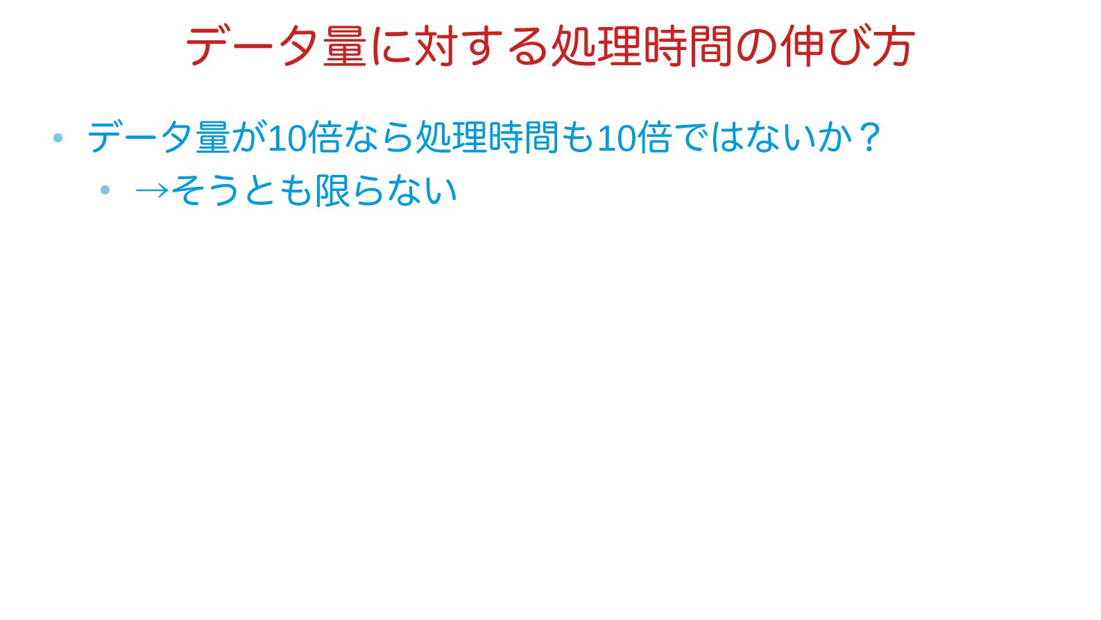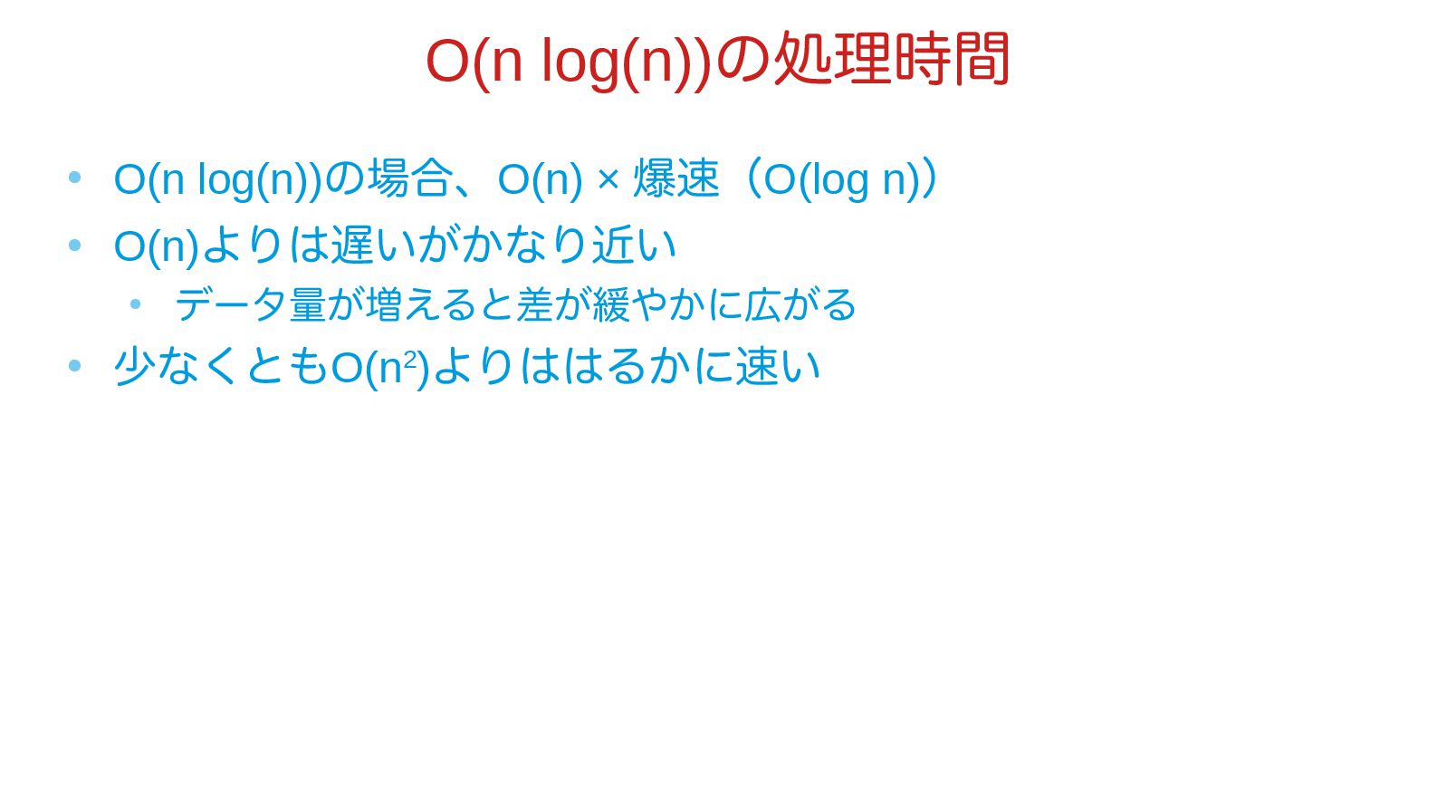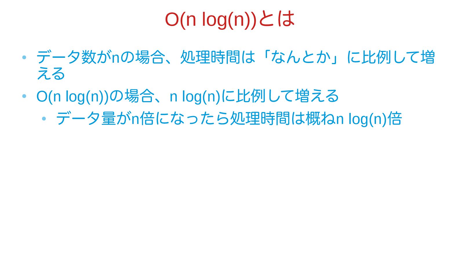 • データ量がn倍になったら処理時間は概ねn log(n)倍