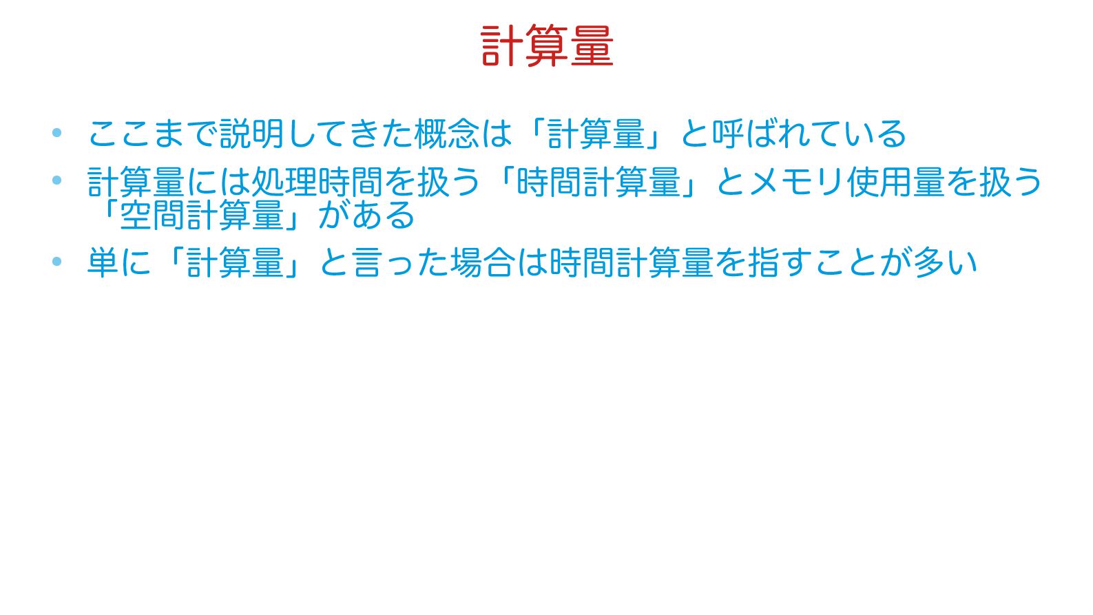20 計算量 • ここまで説明してきた概念は「計算量」と呼ばれている • 計算量には処理時間を扱う「時間計算量」とメモリ使用量を扱う 「空間計算量」がある • 単に「計算量」と言った場合は時間計算量を指すことが多い
