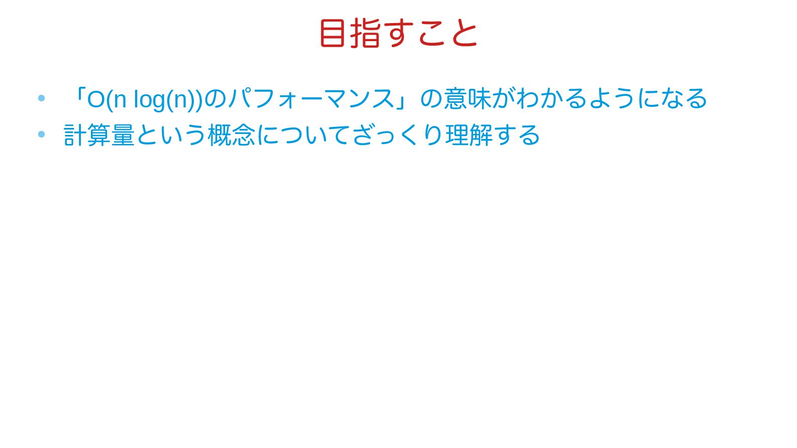 3 目指すこと • 「O(n log(n))のパフォーマンス」の意味がわかるようになる • 計算量という概念についてざっくり理解する