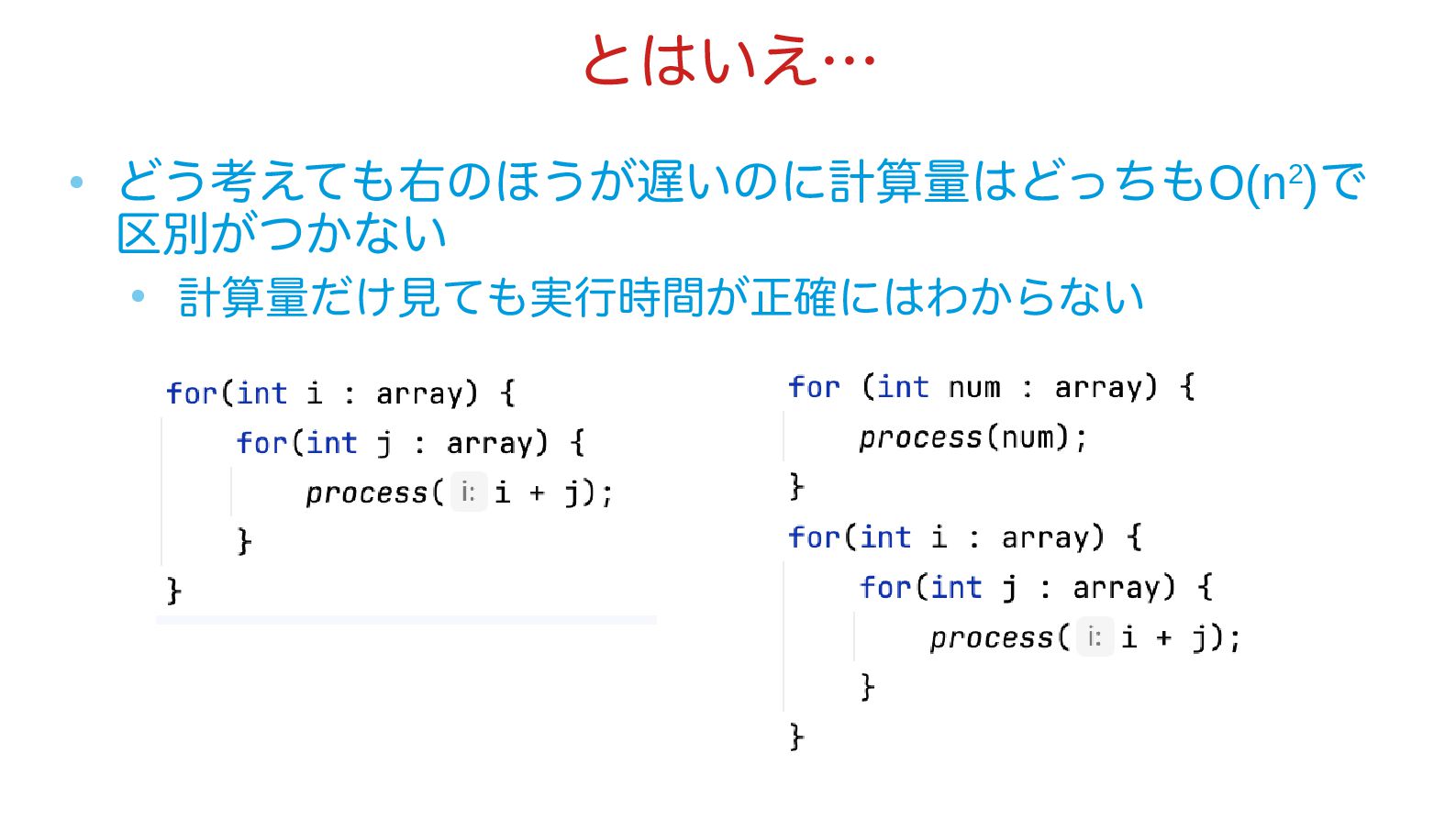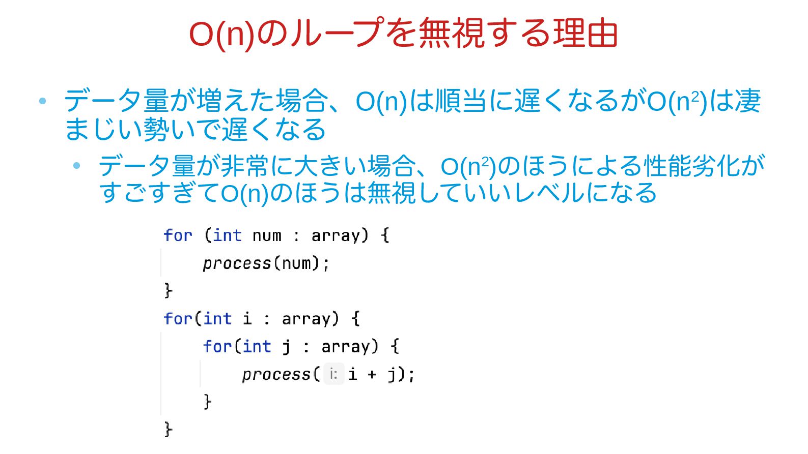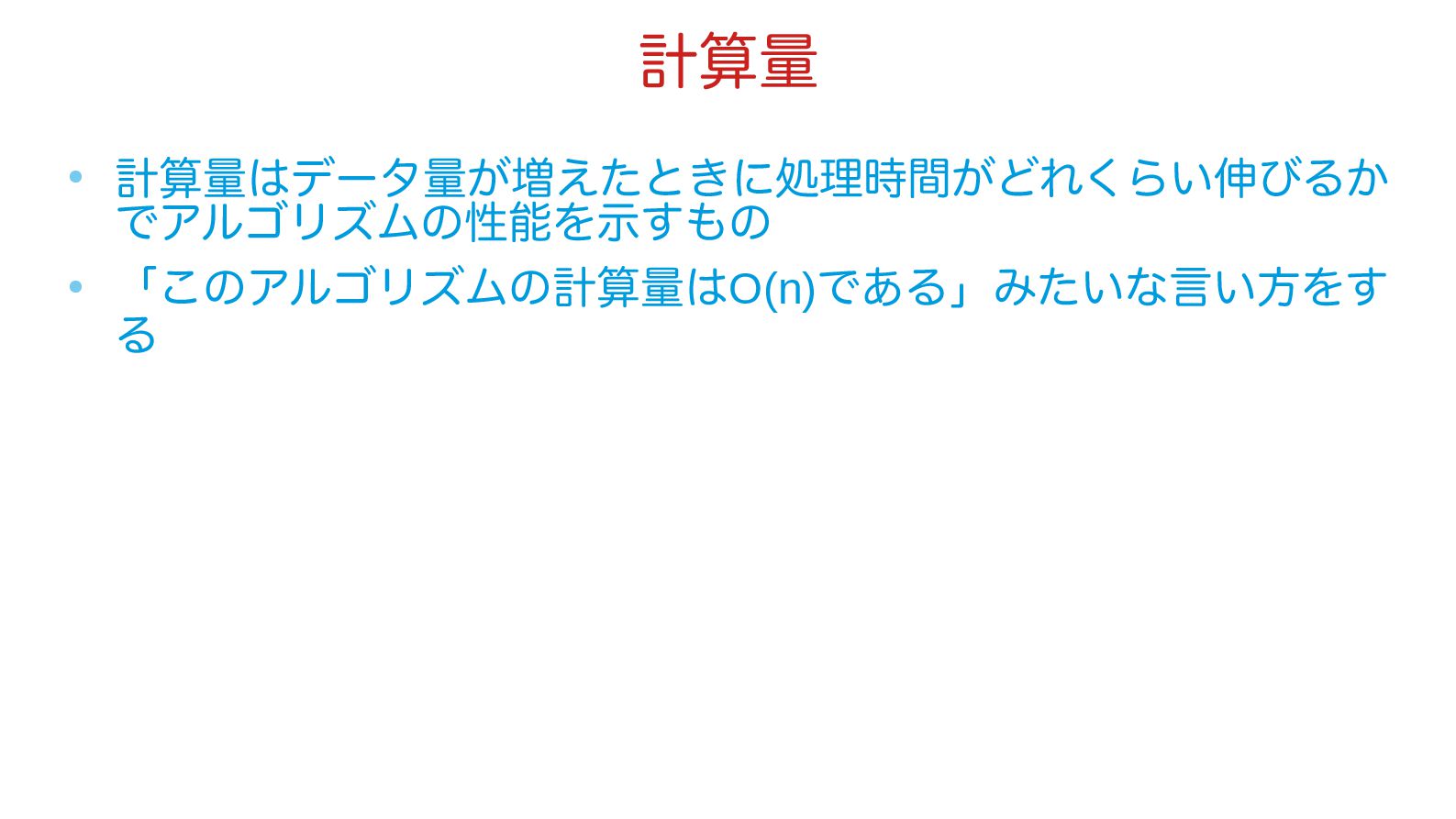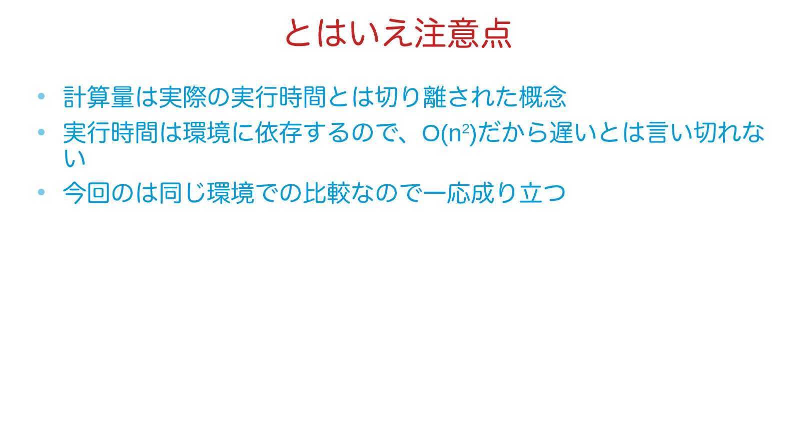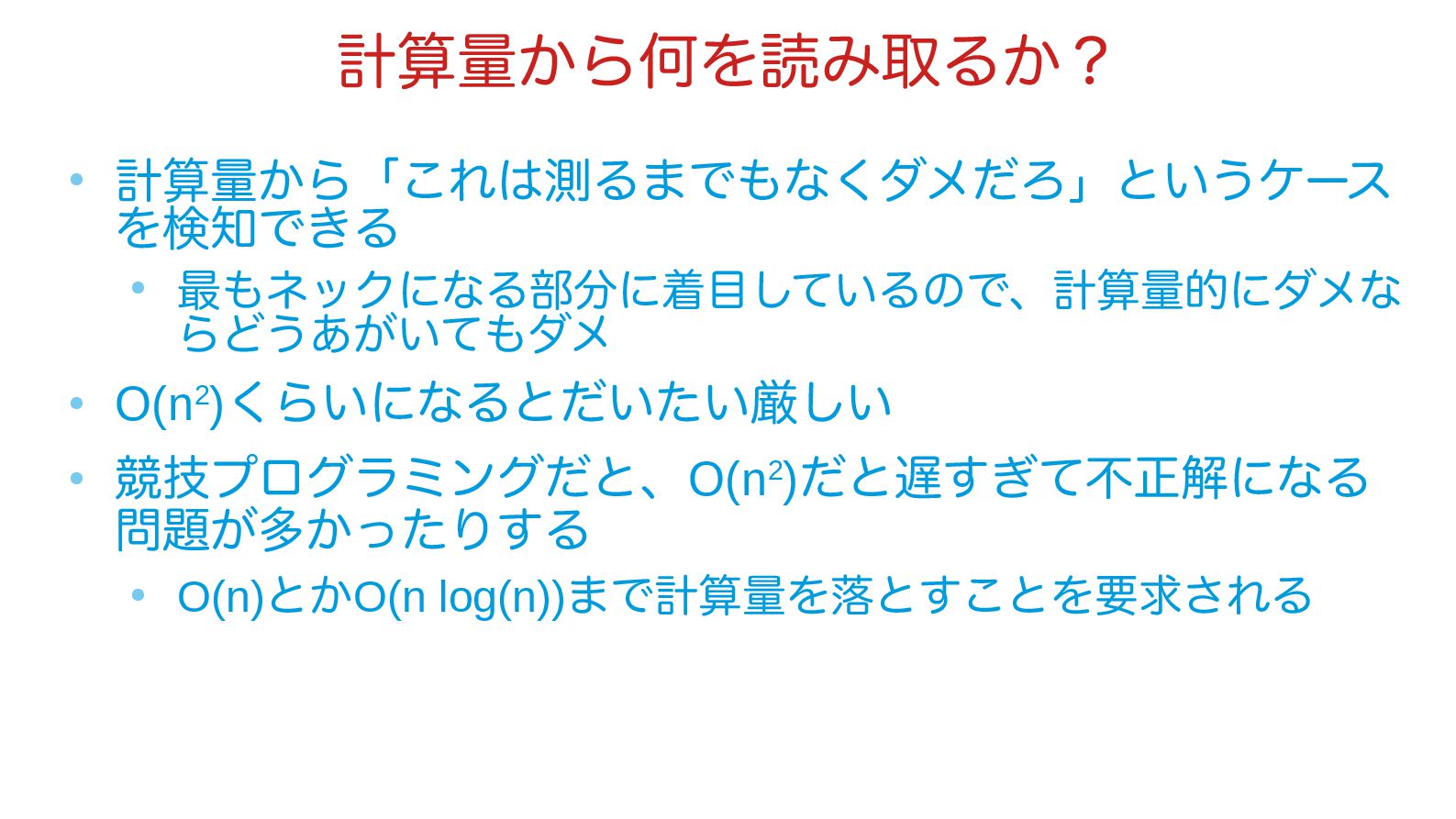 • 競技プログラミングだと、O(n2)だと遅すぎて不正解になる 問題が多かったりする • O(n)とかO(n log(n))まで計算量を落とすことを要求される