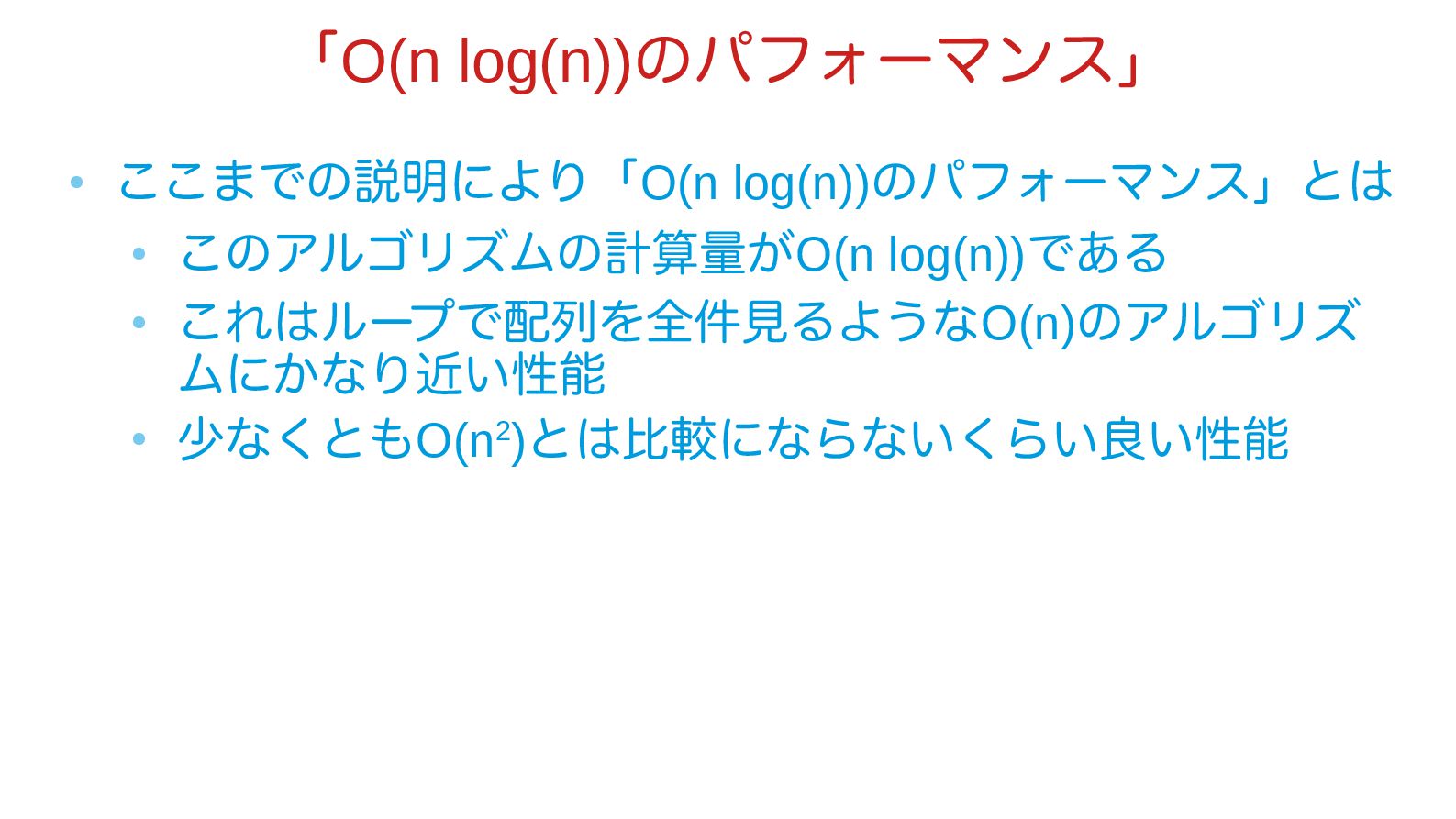 22 「O(n log(n))のパフォーマンス」 • ここまでの説明により「O(n log(n))のパフォーマンス」とは • このアルゴリズムの計算量がO(n log(n))である •