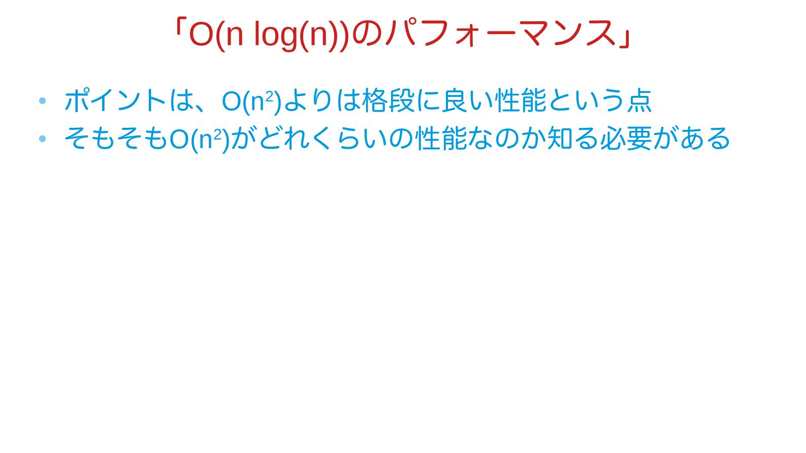 23 「O(n log(n))のパフォーマンス」 • ポイントは、O(n2)よりは格段に良い性能という点 • そもそもO(n2)がどれくらいの性能なのか知る必要がある