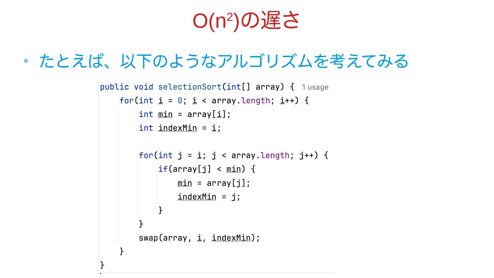 25 O(n2)の遅さ • これは選択ソートの実装 • 計算量はO(n2) • 二重ループ