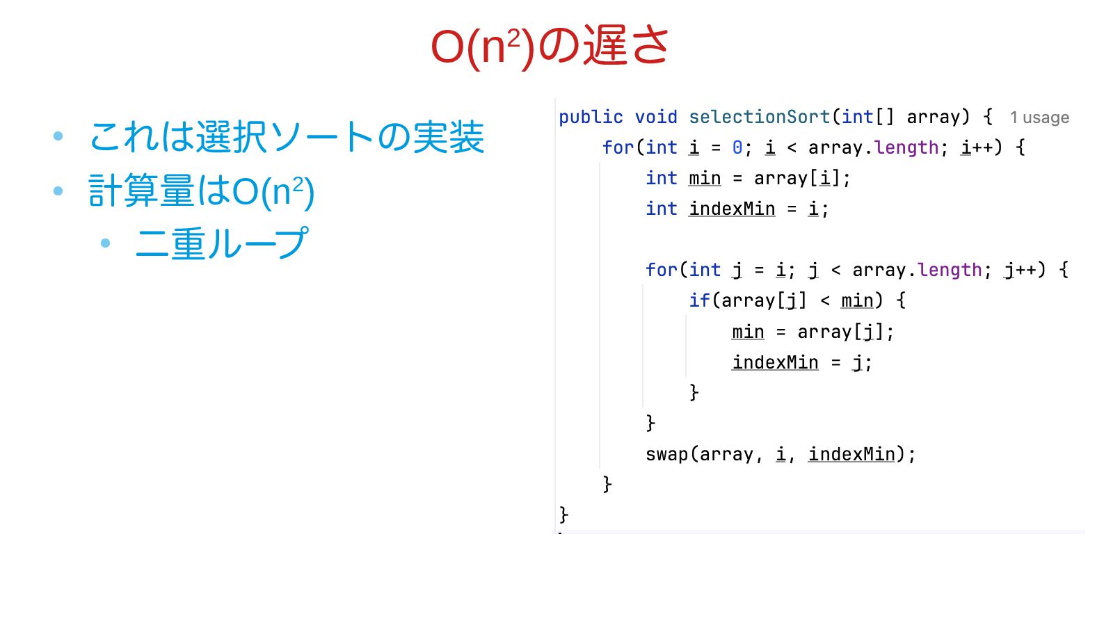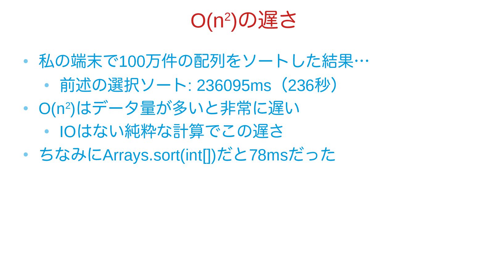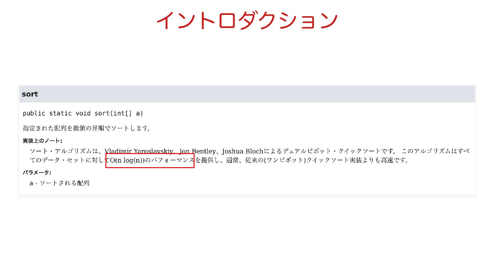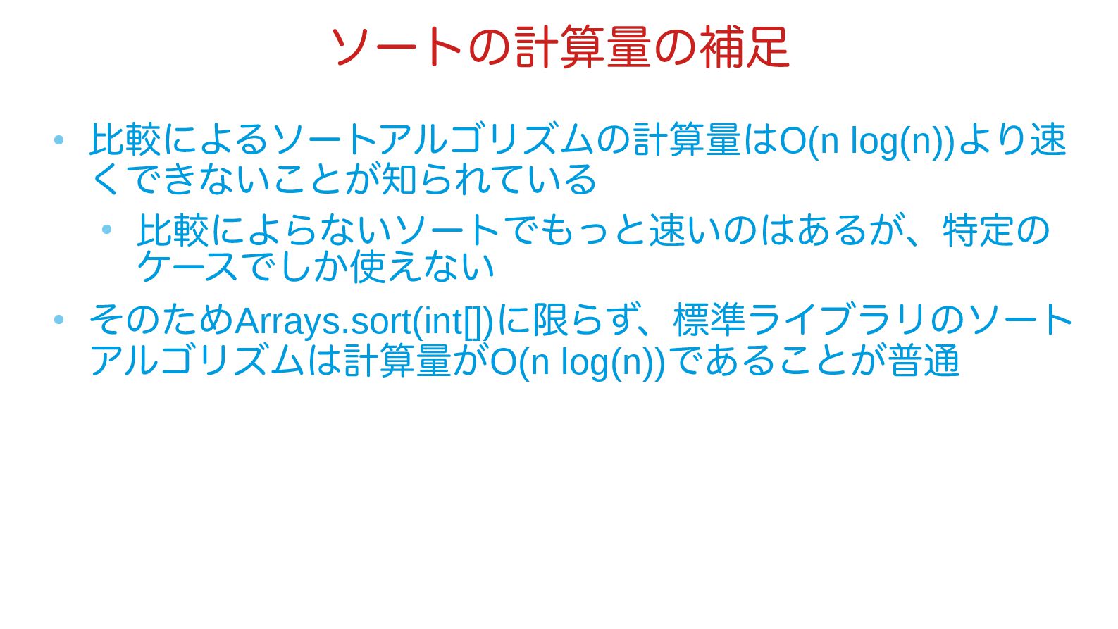 そのためArrays.sort(int[])に限らず、標準ライブラリのソート アルゴリズムは計算量がO(n log(n))であることが普通
