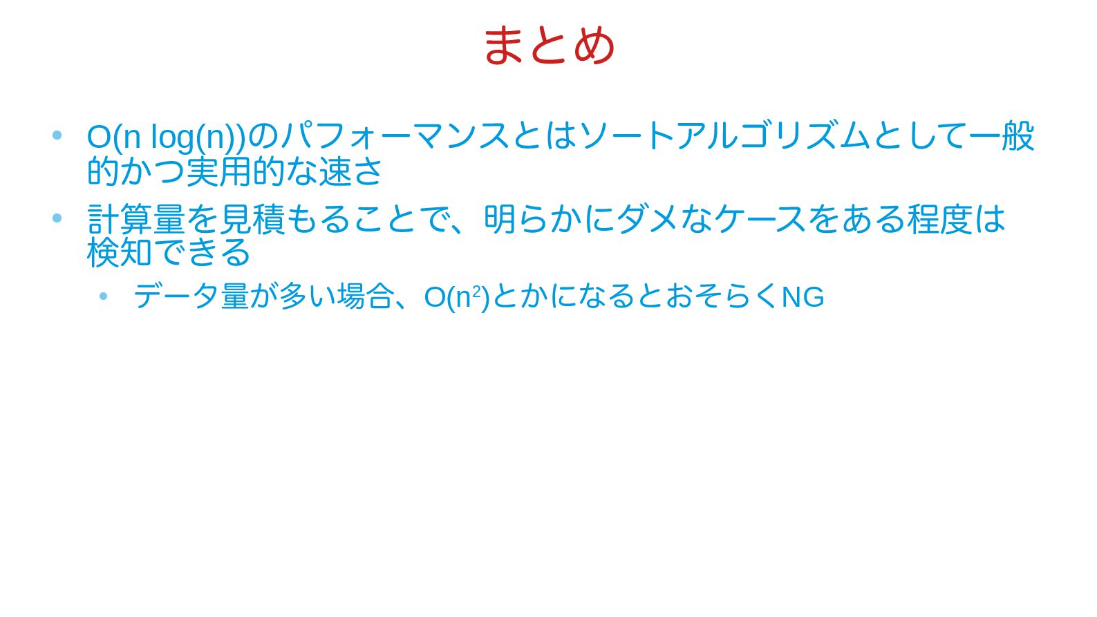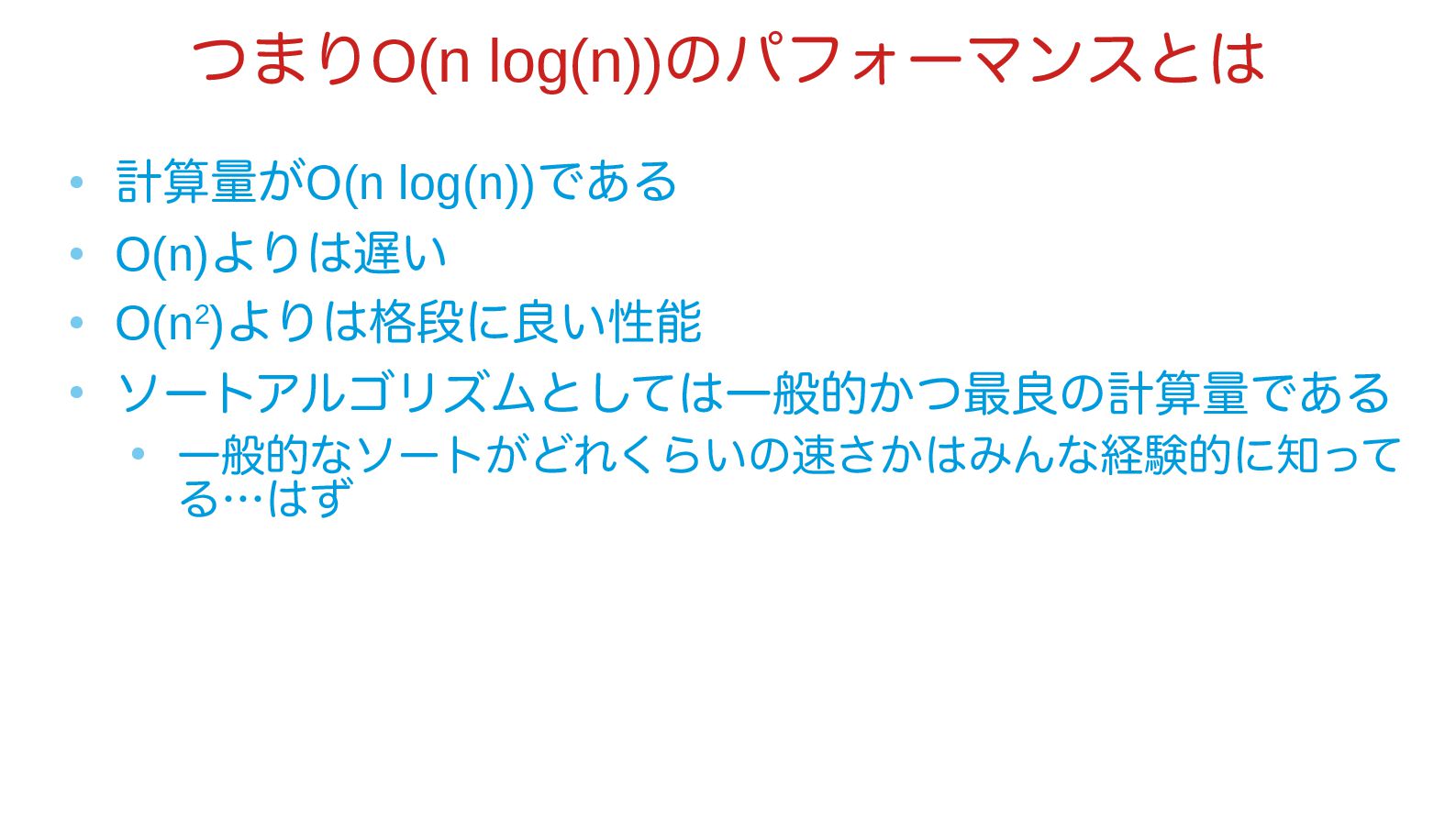 • ソートアルゴリズムとしては一般的かつ最良の計算量である • 一般的なソートがどれくらいの速さかはみんな経験的に知って る…はず