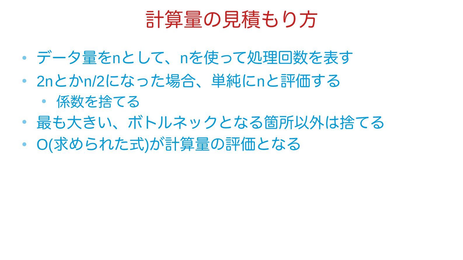 30 計算量の見積もり方 • データ量をnとして、nを使って処理回数を表す • 2nとかn/2になった場合、単純にnと評価する • 係数を捨てる • 最も大きい、ボトルネックとなる箇所以外は捨てる