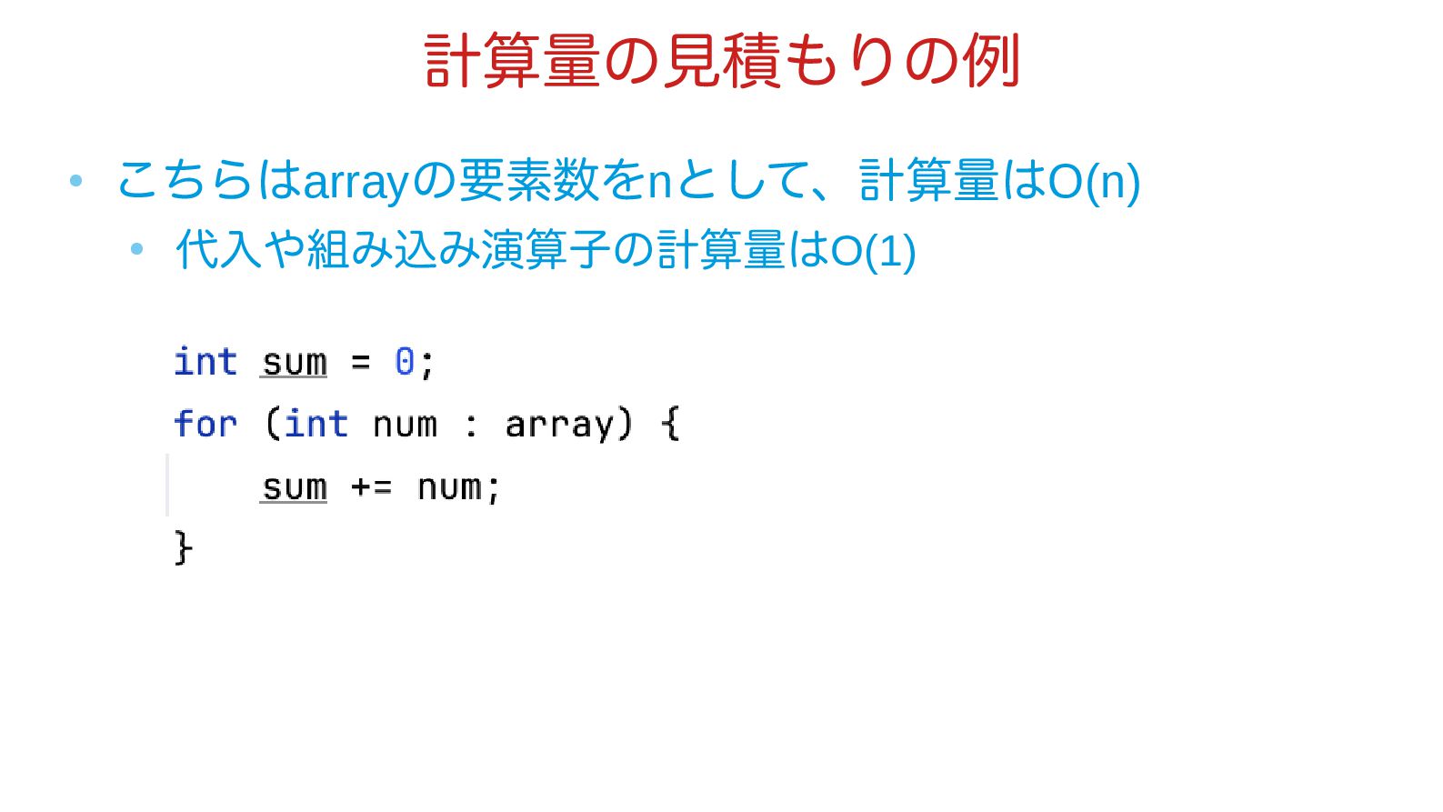32 計算量の見積もりの例 • こちらはarrayの要素数をnとして、計算量はO(n) • 代入や組み込み演算子の計算量はO(1)