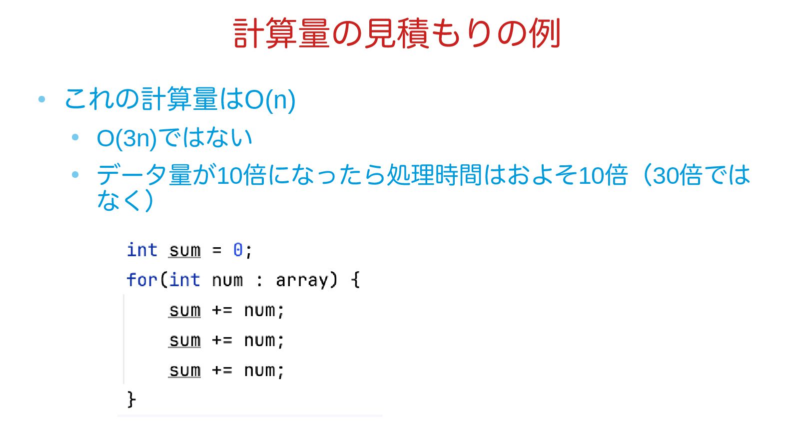 34 計算量の見積もりの例 • これの計算量はO(n) • O(3n)ではない • データ量が10倍になったら処理時間はおよそ10倍(30倍では なく)