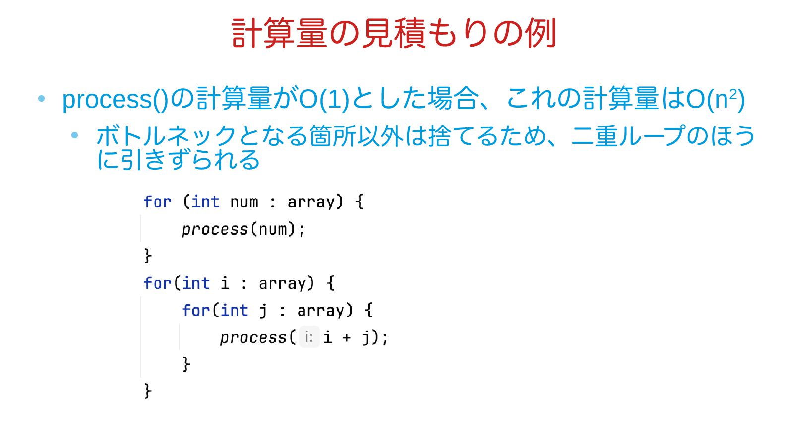 36 計算量の見積もりの例 • process()の計算量がO(1)とした場合、これの計算量はO(n2) • ボトルネックとなる箇所以外は捨てるため、二重ループのほう に引きずられる