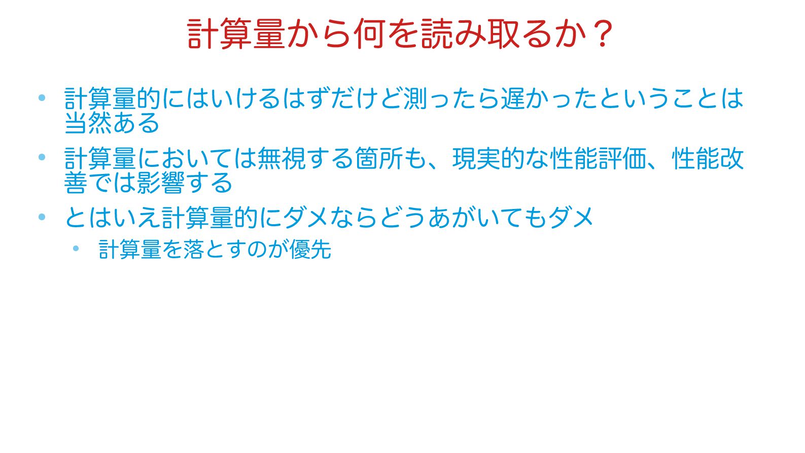 41 計算量から何を読み取るか? • 計算量から「これは測るまでもなくダメだろ」というケース を検知できる • 最もネックになる部分に着目しているので、計算量的にダメな らどうあがいてもダメ • O(n2)くらいになるとだいたい厳しい