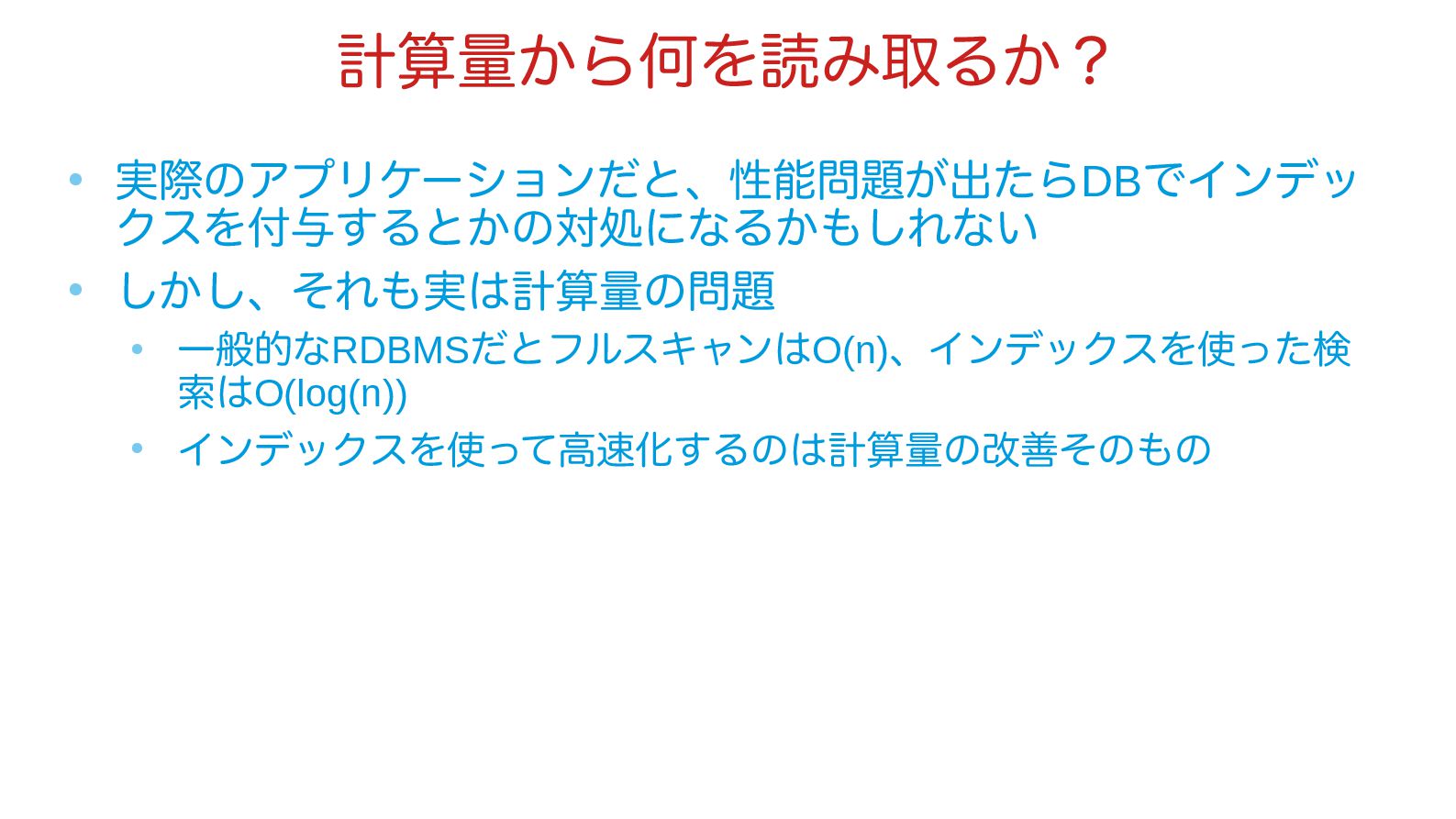 43 計算量から何を読み取るか? • 実際のアプリケーションだと、性能問題が出たらDBでインデッ クスを付与するとかの対処になるかもしれない • しかし、それも実は計算量の問題 • 一般的なRDBMSだとフルスキャンはO(n)、インデックスを使った検 索はO(log(n))