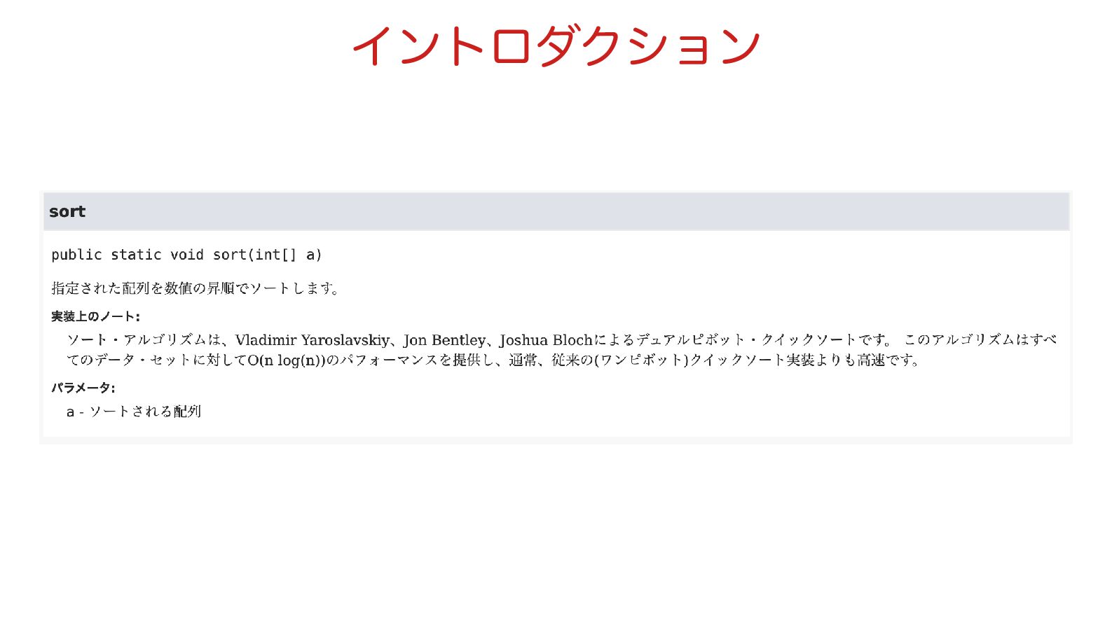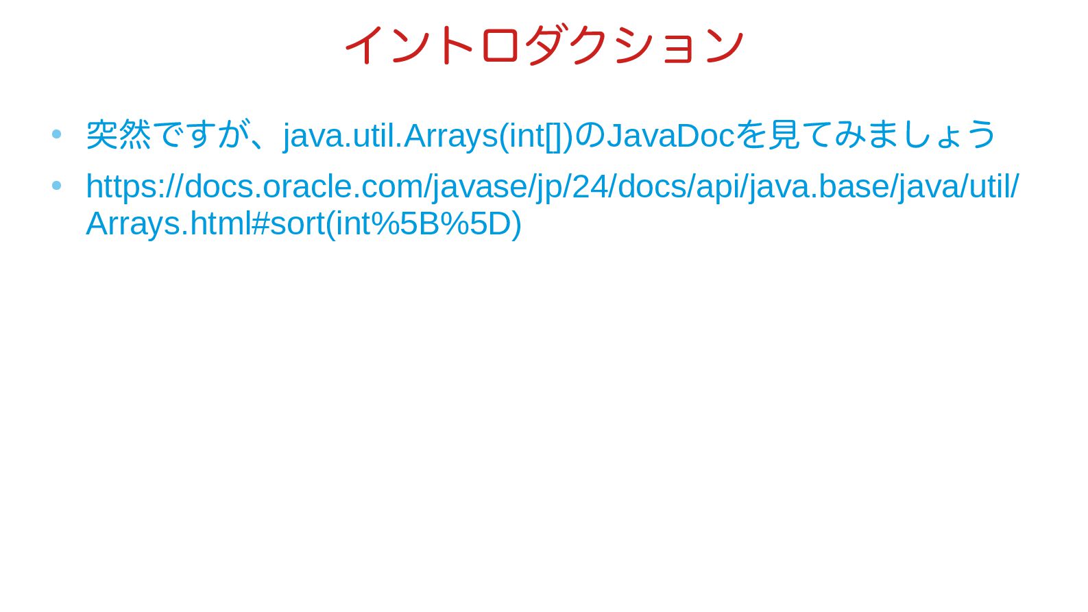 5 イントロダクション • 突然ですが、java.util.Arrays(int[])のJavaDocを見てみましょう • https://docs.oracle.com/javase/jp/24/docs/api/java.base/java/util/ Arrays.html#sort(int%5B%5D)