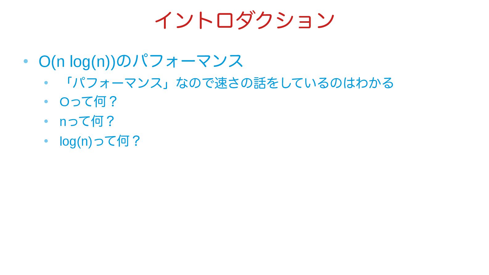 8 イントロダクション • O(n log(n))のパフォーマンス • 「パフォーマンス」なので速さの話をしているのはわかる • Oって何? •