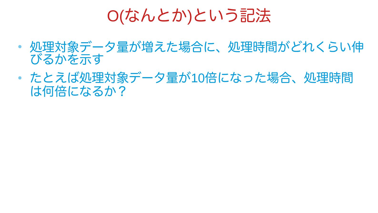 9 O(なんとか)という記法 • 処理対象データ量が増えた場合に、処理時間がどれくらい伸 びるかを示す • たとえば処理対象データ量が10倍になった場合、処理時間 は何倍になるか?