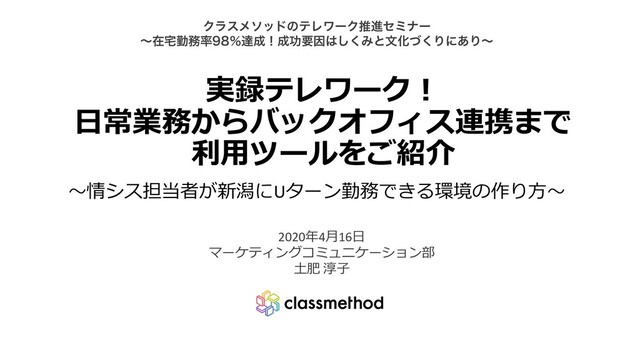 発表:2020年4月16日 クラスメソッド株式会社 主催ウェビナー 「クラスメソッドのテレワーク推進セミナー 〜在宅勤務率98%達成!成功要因はしくみと文化づくりにあり〜」