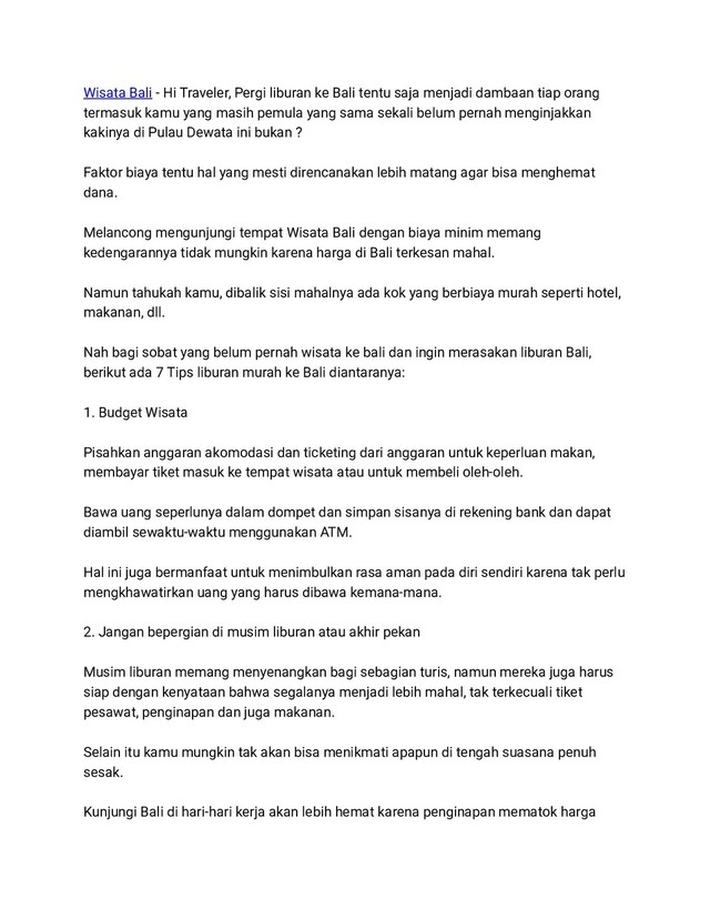 saja menjadi dambaan tiap orang termasuk kamu yang masih pemula yang sama sekali belum pernah menginjakkan kakinya di Pulau Dewata ini bukan ? Faktor biaya tentu hal yang mesti direncanakan lebih matang agar bisa menghemat dana. Melancong mengunjungi tempat Wisata Bali dengan biaya minim memang kedengarannya tidak mungkin karena harga di Bali terkesan mahal. Namun tahukah kamu, dibalik sisi mahalnya ada kok yang berbiaya murah seperti hotel, makanan, dll. Nah bagi sobat yang belum pernah wisata ke bali dan ingin merasakan liburan Bali, berikut ada 7 Tips liburan murah ke Bali diantaranya: 1. Budget Wisata Pisahkan anggaran akomodasi dan ticketing dari anggaran untuk keperluan makan, membayar tiket masuk ke tempat wisata atau untuk membeli oleh-oleh. Bawa uang seperlunya dalam dompet dan simpan sisanya di rekening bank dan dapat diambil sewaktu-waktu menggunakan ATM. Hal ini juga bermanfaat untuk menimbulkan rasa aman pada diri sendiri karena tak perlu mengkhawatirkan uang yang harus dibawa kemana-mana. 2. Jangan bepergian di musim liburan atau akhir pekan Musim liburan memang menyenangkan bagi sebagian turis, namun mereka juga harus siap dengan kenyataan bahwa segalanya menjadi lebih mahal, tak terkecuali tiket pesawat, penginapan dan juga makanan. Selain itu kamu mungkin tak akan bisa menikmati apapun di tengah suasana penuh sesak. Kunjungi Bali di hari-hari kerja akan lebih hemat karena penginapan mematok harga