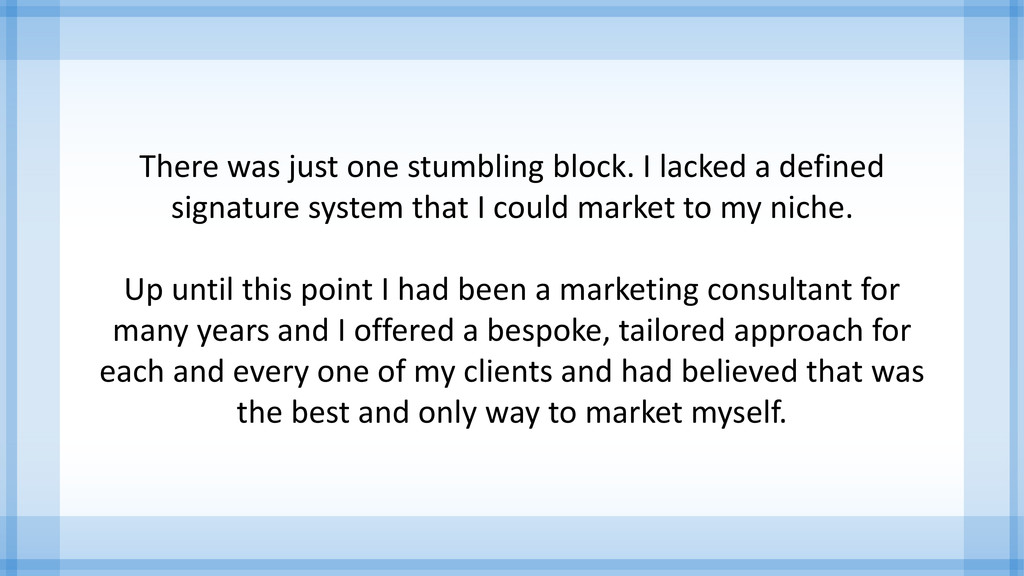 signature system that I could market to my niche. Up until this point I had been a marketing consultant for many years and I offered a bespoke, tailored approach for each and every one of my clients and had believed that was the best and only way to market myself.