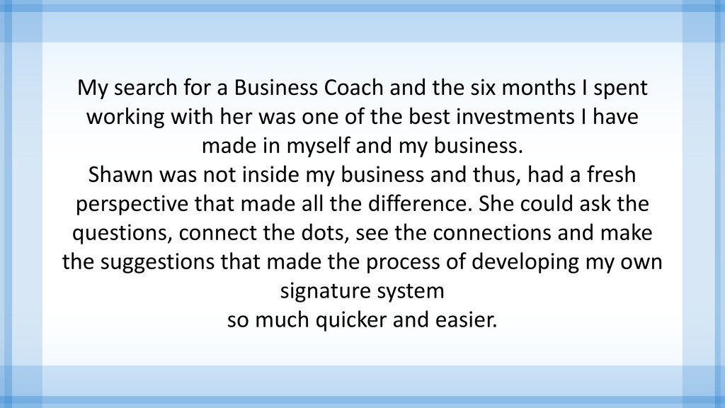 I spent working with her was one of the best investments I have made in myself and my business. Shawn was not inside my business and thus, had a fresh perspective that made all the difference. She could ask the questions, connect the dots, see the connections and make the suggestions that made the process of developing my own signature system so much quicker and easier.