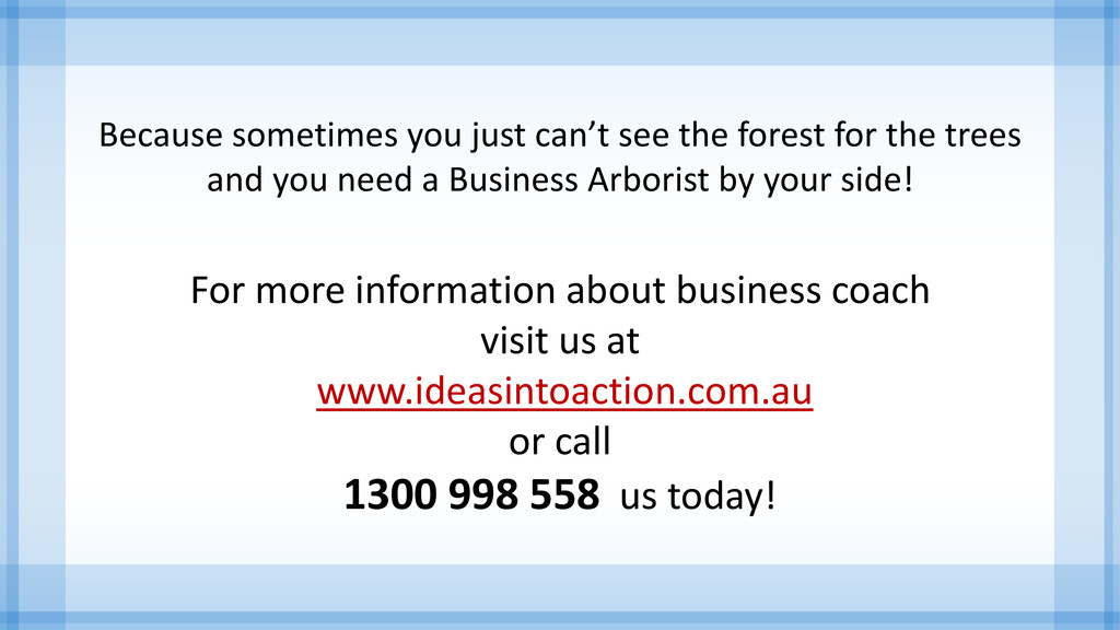 trees and you need a Business Arborist by your side! For more information about business coach visit us at www.ideasintoaction.com.au or call 1300 998 558 us today!