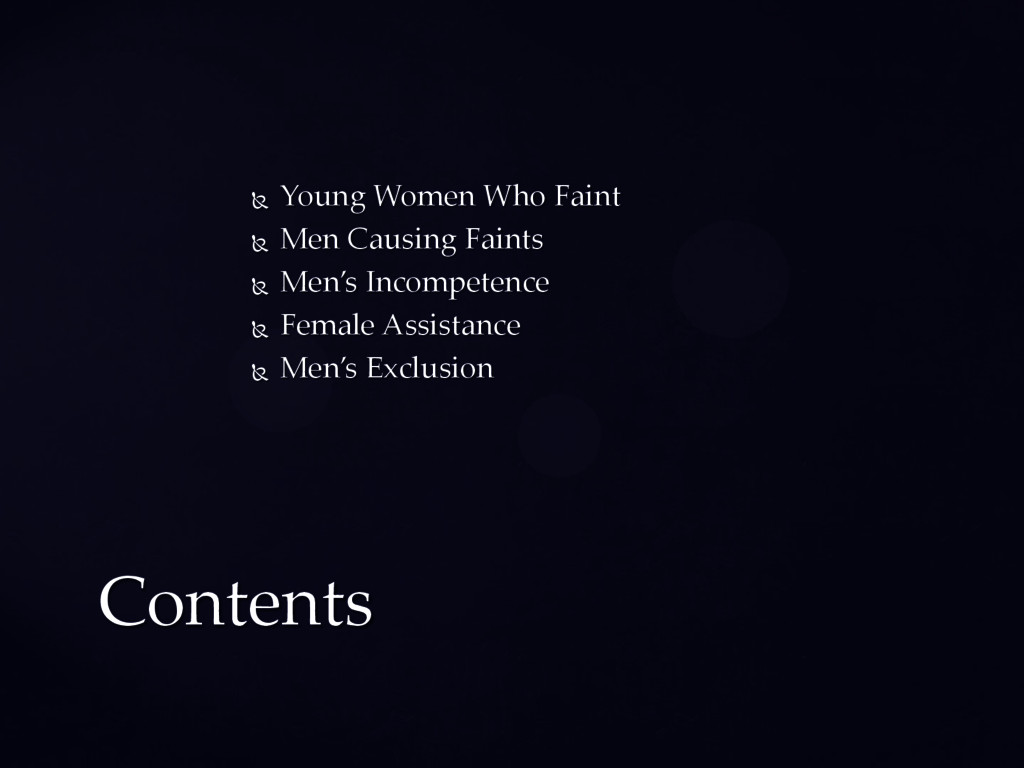 mentioned” (BR) Being threatened “..the males turned pale, and the females fainted.” (PP) Being saved “…Barbara,……..is, found to be in a swoon by herself in the back parlour.” (OCS) Offering marriage “…she (witness) fainted away stone dead when Mr. Saunders asked her to name the day, and believed that everybody as called herself a lady would do the same, under such circumstances” (PP) Actually marrying “….Miss Petowker…encountered the youthful bridegroom then she fainted away with great decorum.” (NN) Men Causing Faints