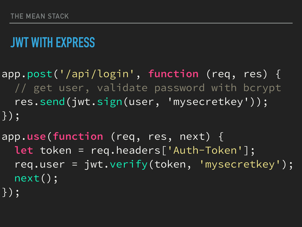 { // get user, validate password with bcrypt res.send(jwt.sign(user, 'mysecretkey')); }); app.use(function (req, res, next) { let token = req.headers['Auth-Token']; req.user = jwt.verify(token, 'mysecretkey'); next(); });