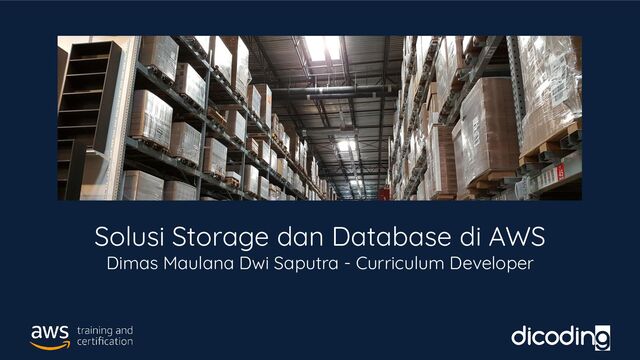 Tetap kembangkan skill-mu di era pandemi. Jadikan hari-harimu lebih produktif dengan asah pengetahuan dan skill di Dicoding Event. Kali ini Dicoding LIVE bersama Amazon Web Service Indonesia akan membahas tentang "Storage dan Database di AWS"