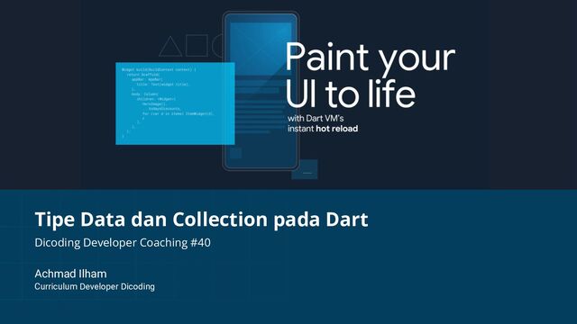 Dicoding Developer Coaching kali ini akan membahas materi/maupun pertanyaan seputar kelas Memulai Pemrograman dengan Dart dengan tema "Tipe Data dan Collection pada Dart." Flutter menjadi semakin digemari oleh developer dan pengguna aplikasi. Hal ini dikarenakan kemudahan dalam pengembangan aplikasinya. Di samping itu, Flutter juga memungkinkan para pengembang aplikasi untuk membuat satu aplikasi di dua platform yang berbeda.