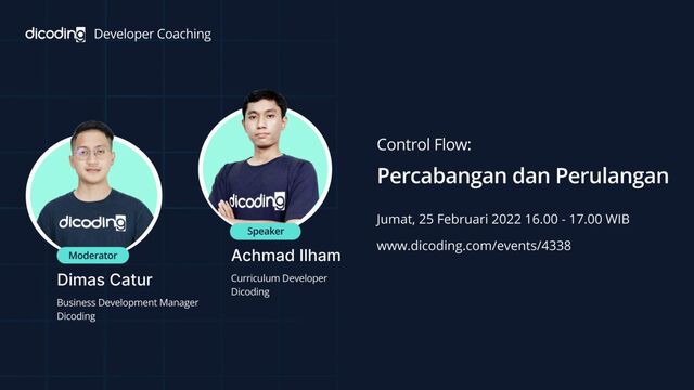 Control Flow merupakan cara untuk menyusun sebuah intruksi yang mengevaluasi pernyataan atau kondisi untuk menjalankan baris kode tertentu. Poin-poin yang akan dibahas pada Dicoding Developer Coaching ini adalah: