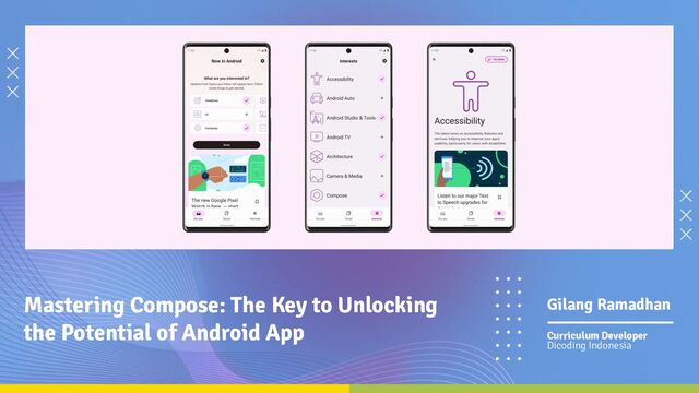 Modifier.background(Color.Magenta) ) Hello Compose Text( "Hello Compose!", Modifier.background(Color.Magenta) .size(200.dp, 30.dp) ) Hello Compose Text( "Hello Compose!", Modifier.background(Color.Magenta) .size(200.dp, 30.dp) .padding(5.dp) ) Hello Compose Hello Compose Text( "Hello Compose!", Modifier.background(Color.Magenta) .size(200.dp, 30.dp) .padding(5.dp) .clickable { // Called when Text clicked } ) Text( "Hello Compose!", Modifier.background(Color.Magenta) .size(200.dp, 30.dp) .padding(5.dp) .clickable { // Called when Text clicked } ) Hello Compose Hello Compose Text( "Hello Compose!", Modifier.background(Color.Magenta) .size(200.dp, 30.dp) .clickable { // Called when Text clicked } .padding(5.dp) ) Modifiers allow you to decorate or augment a composable. Modifiers let you do these sorts of things: • Change the composable's size, layout, behavior, and appearance; • Add information, like accessibility labels; • Process user input; and • Add high-level interactions, like making an element clickable, scrollable, draggable, or zoomable.