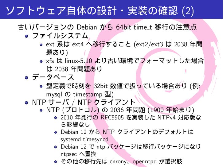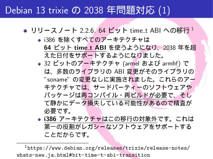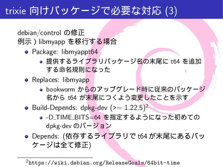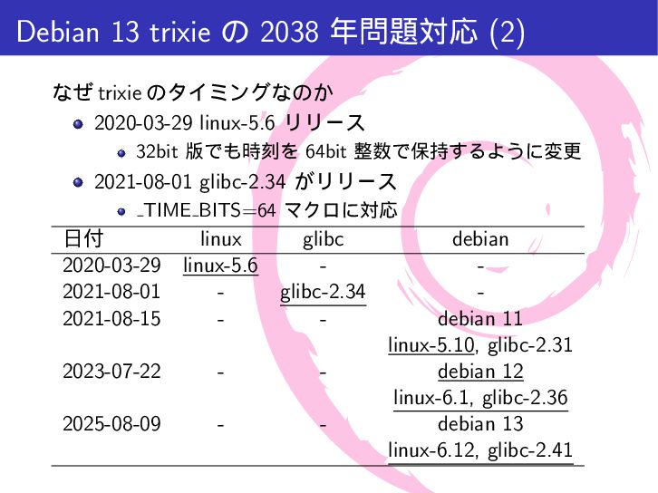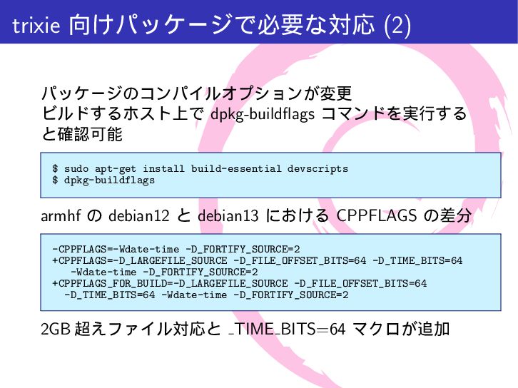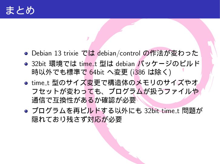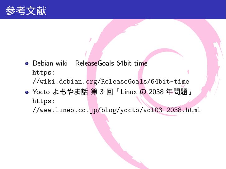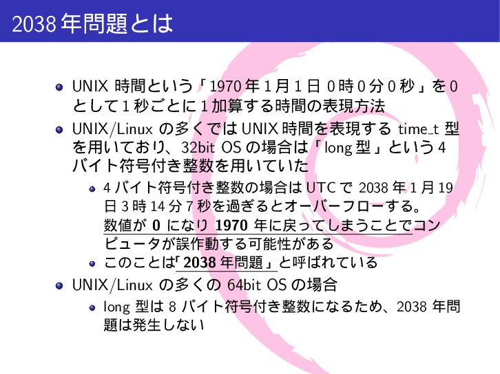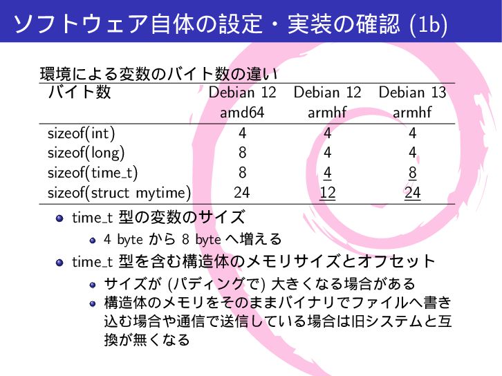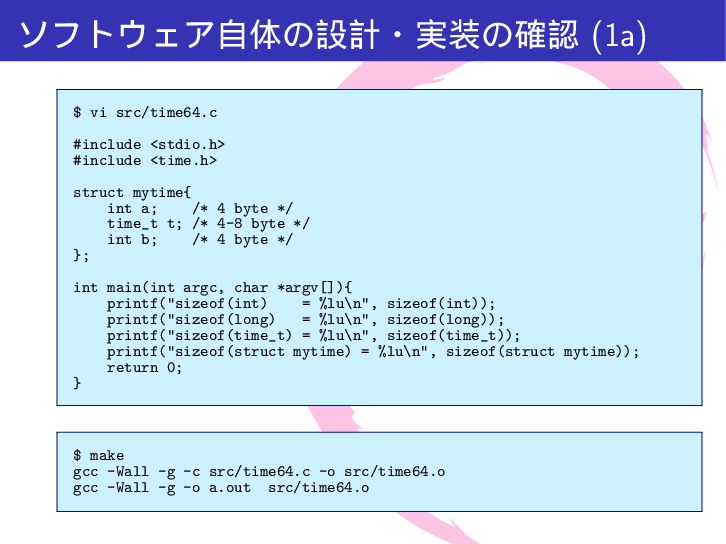 mytime{ int a; /* 4 byte */ time_t t; /* 4-8 byte */ int b; /* 4 byte */ }; int main(int argc, char *argv[]){ printf("sizeof(int) = %lu\n", sizeof(int)); printf("sizeof(long) = %lu\n", sizeof(long)); printf("sizeof(time_t) = %lu\n", sizeof(time_t)); printf("sizeof(struct mytime) = %lu\n", sizeof(struct mytime)); return 0; } $ make gcc -Wall -g -c src/time64.c -o src/time64.o gcc -Wall -g -o a.out src/time64.o