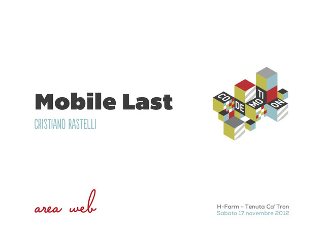 Un recente libro di Luke Wroblewski, intitolato "Mobile First" ha coniato questa definizione di un approccio alla progettazione che poi è stato dato per scontato dalla maggior parte degli interaction/ux/web designer. In questo talk vorrei invece portare la mia esperienza nella realizzazione di diversi siti web "responsive" che è invece diametralmente opposto, spiegando le ragioni che mi hanno portato a questa scelta e il metodo che ho adottato e consolidato negli ultimi mesi.