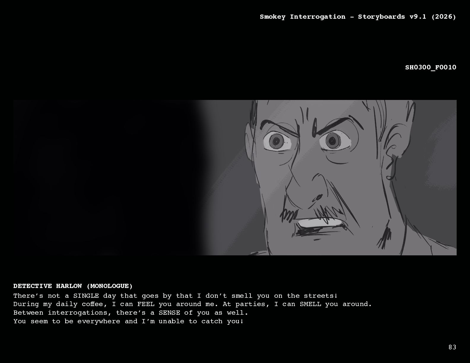 (MONOLOGUE) There’s not a SINGLE day that goes by that I don’t smell you on the streets! During my daily coffee, I can FEEL you around me. At parties, I can SMELL you around. Between interrogations, there’s a SENSE of you as well. You seem to be everywhere and I’m unable to catch you!