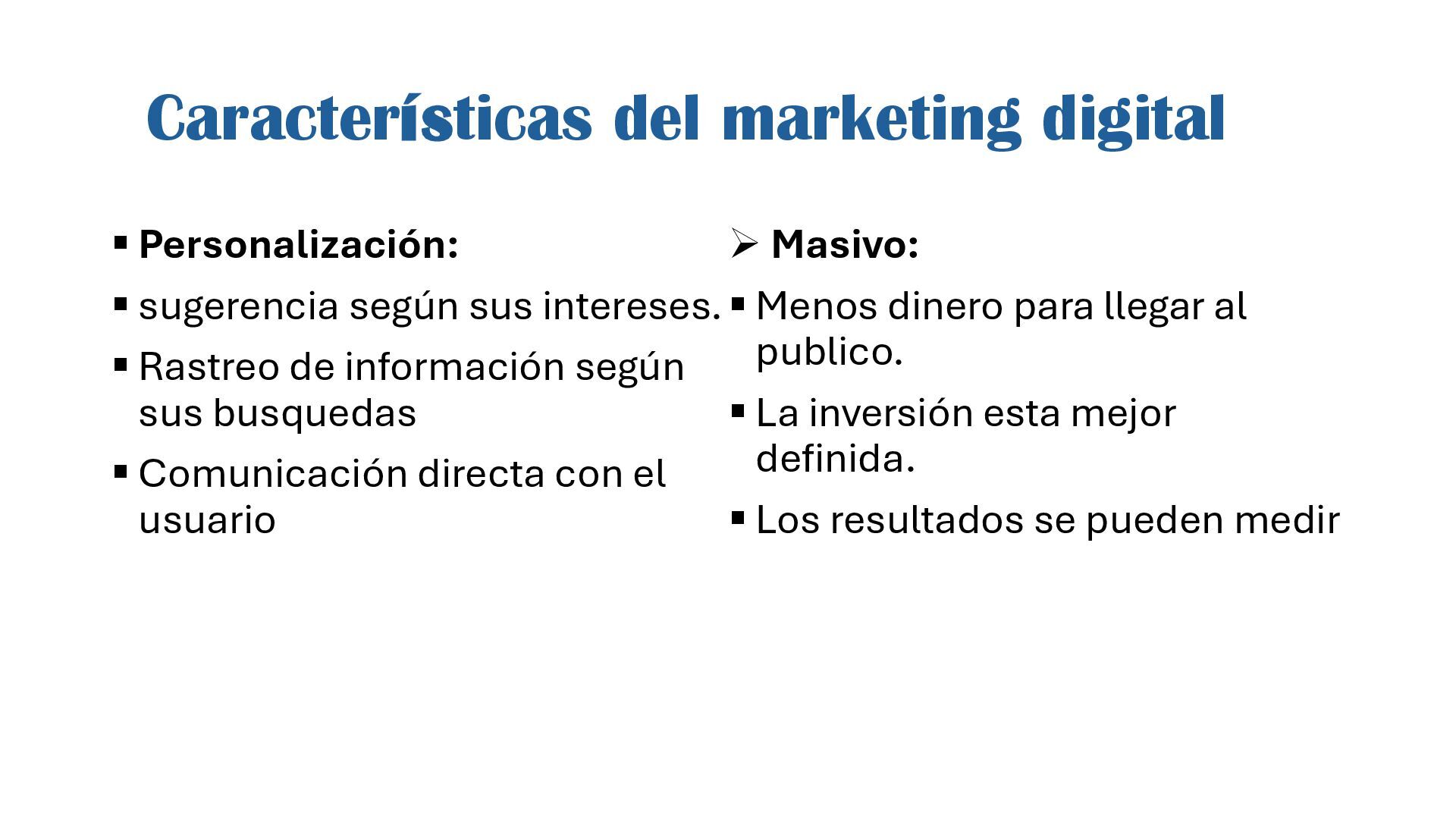 intereses. ▪ Rastreo de información según sus busquedas ▪ Comunicación directa con el usuario ➢ Masivo: ▪ Menos dinero para llegar al publico. ▪ La inversión esta mejor definida. ▪ Los resultados se pueden medir